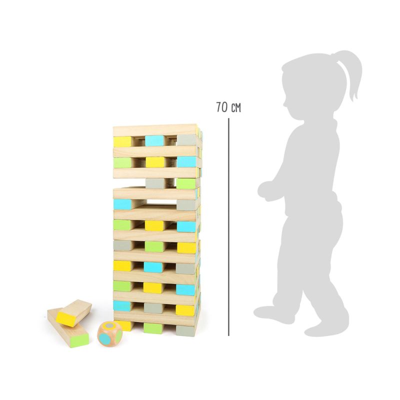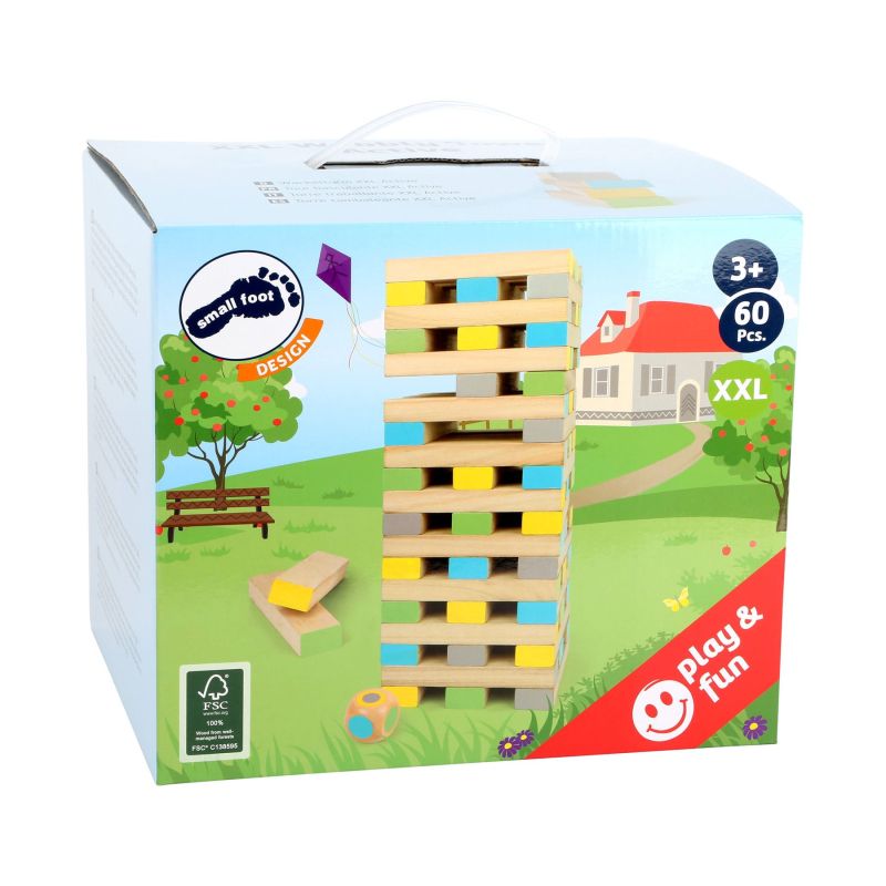 Популярна, класическа игра в XXL формат! Настолната дженга се състои от 61 части, изработена от FSC® 100% сертифицирано дърво и е идеална за игра на открито. Играта тренира сръчността и логиката на участниците, докато те изтеглят отделни блокове от кулата. Друга особеност е включената цветна матрица, която диктува кое кубче със съответния цвят трябва да бъде изтеглено.Частите са оцветени в светлозелено, жълто, синьо и сиво, така че да са видими и в игра на открито, на трева. Тази игра е хит както за младите, така и за по-възрастните играчи и едновременно тренира търпението, двигателни умения и логиката.