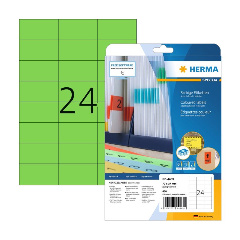 Herma Самозалепващи се етикети, A4, 70 х 37 mm, зелени, 24 броя, 20 листа