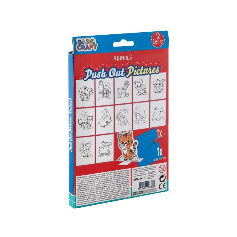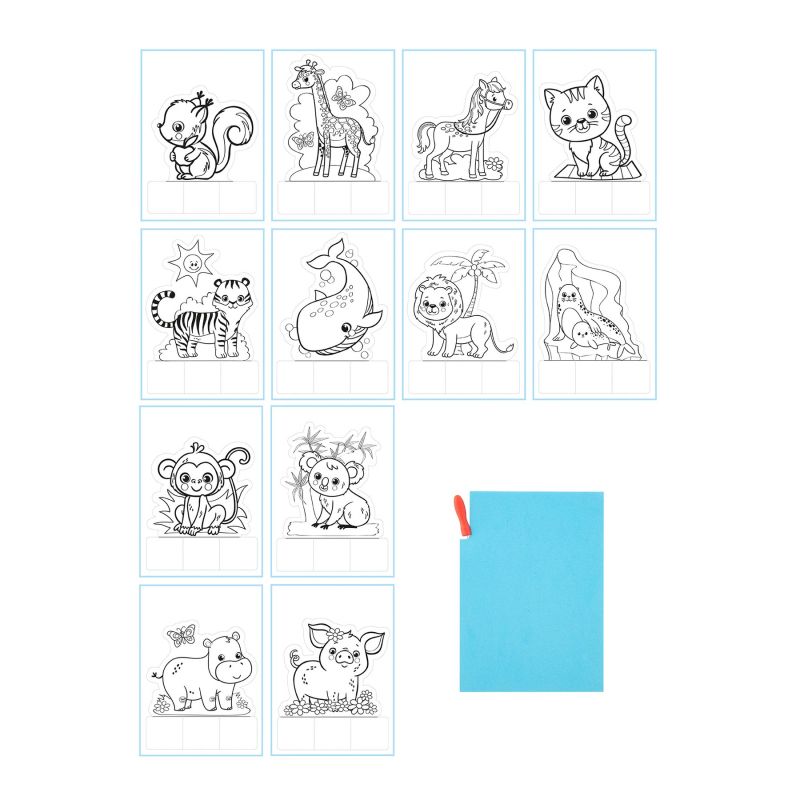 Този занимателен комплект за деца съдържа 12 шаблона за оцветяване с мотиви на животни, инструмент за отделяне на самият шаблон от листа и флумастер.