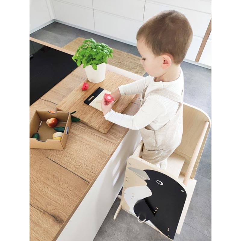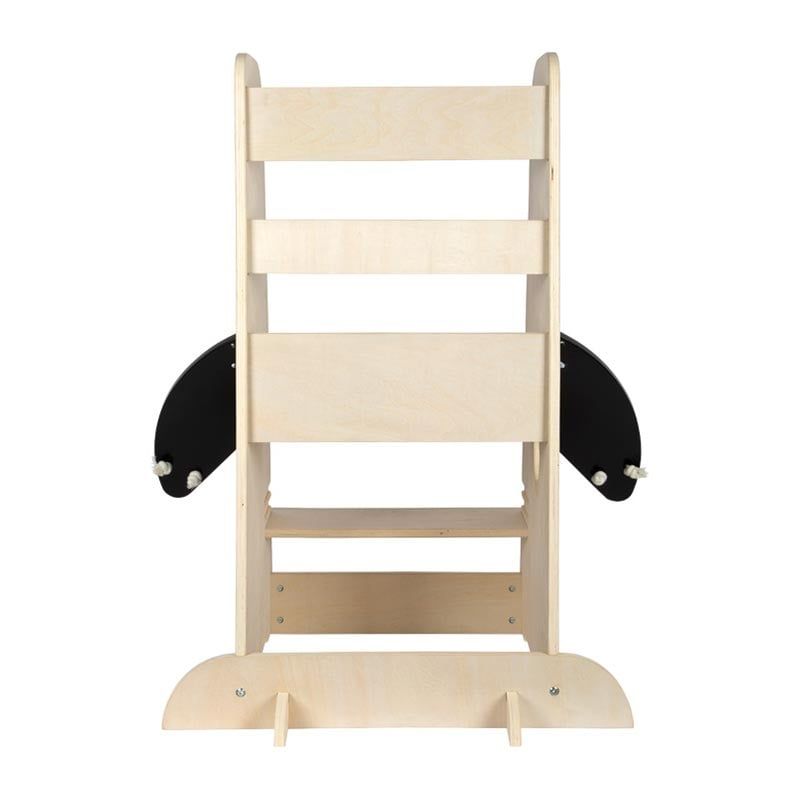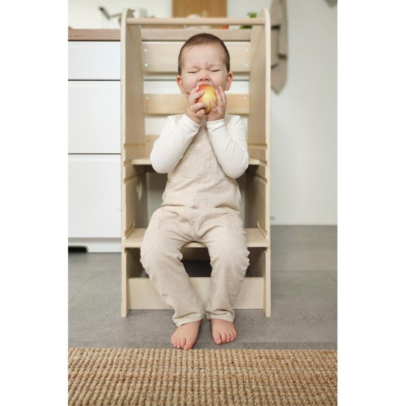 Тази дървена помощна кула е вдъхновена от принципите на Монтесори образователни играчки, които стимулират независимостта и увереността на детето. Благодарение на стабилната си конструкция, тя осигурява сигурност и удобство при използване, докато детето се учи да бъде по-самостоятелно.