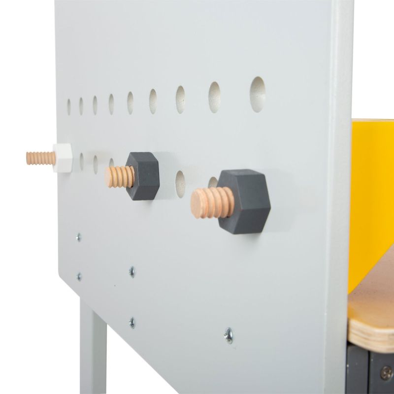Рязане, завъртане на винтове и чукане с чук! Развийте фините двигателни умения, чрез комплектът от работна маса с инструменти. Функционалните акценти са интегрираният циркуляр за играчки, нивелирът и електрическата отвертка за играчки с три сменяеми части. Строителните проекти могат да бъдат скицирани върху повърхността на дъската и в зависимост от това къде са прикрепени малките кутии за съхранение, те могат да се използват като държач за инструменти или място за съхранение. И ето специален акцент – децата могат да помогнат при сглобяването на работната маса!