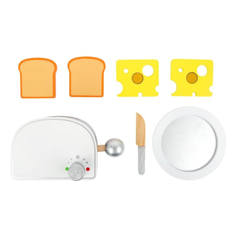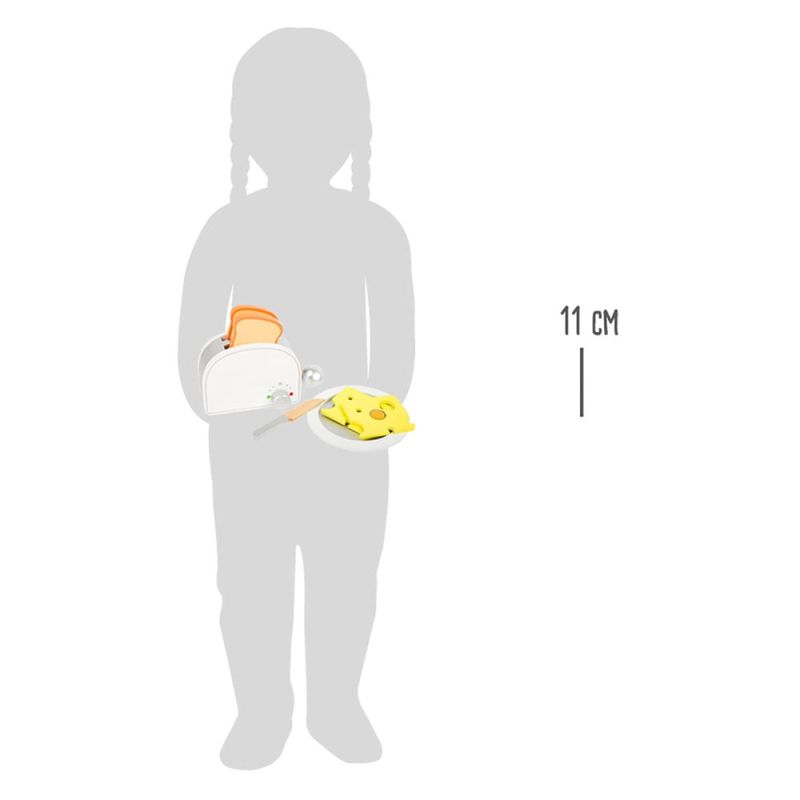 Компактният дървен тостер прави закуската два пъти по-забавна! Филийките се препичат, докато не изскочат, след което са готови да отидат в чинията с резен сирене! Частите на сиренето са прикрепени с Velcro® и могат да се отделят с включения дървен нож. И сега, забавлявайте се!