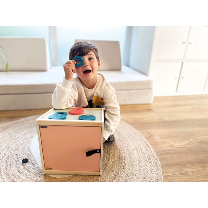Изострете сетивата си по забавен начин! Тази сензорна кутия има два отвора отстрани и предлага изобилие от възможности за изследване на обекти с помощта на допир, зрение, обоняние и слух. Увеличително стъкло, леща на калейдоскоп и червена леща ви позволяват да видите предметите в кутията по нов начин. Скосената горна страна на кутията улеснява гледането и докосването на предметите.