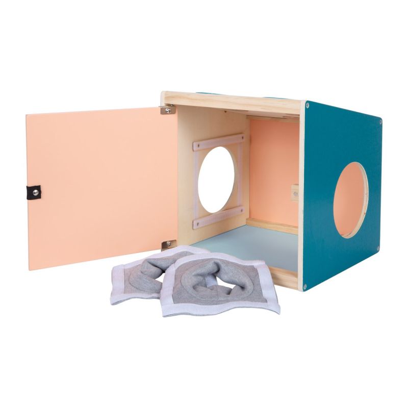 Трите обвити в дърво лещи могат лесно да се отстранят, което позволява отворите в горната част на кутията да се използват за гледане, подушване и слушане. Количеството светлина в кутията може да се контролира чрез ъгъла на отваряне на задната врата и горния отвор. Голяма сензорна кутия, изработена от дърво, с два отвора за достигане и изследване на предмети.