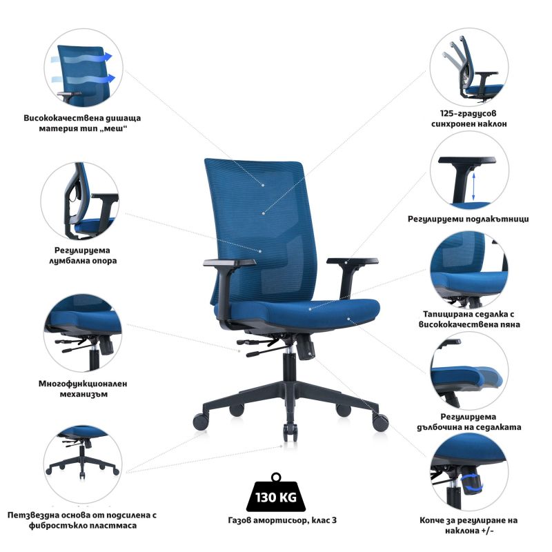 Освен стилен външен вид, столът разполага с множество функционалности, които осигуряват комфорт и удобство по време на целия работен процес. Лумбалната опора в задната част на облегалката ще се погрижи за правилната стойка на гърба Ви и ще намали напрежението в кръста. Ще забравите за болките и дискомфорта и ще се концентрирате изцяло върху работния процес и задълженията си. Дишащата материя на облегалката тип „меш“ позволява на въздуха да циркулира свободно и предпазва гърба Ви от изпотяване през горещите дни.