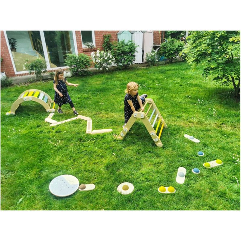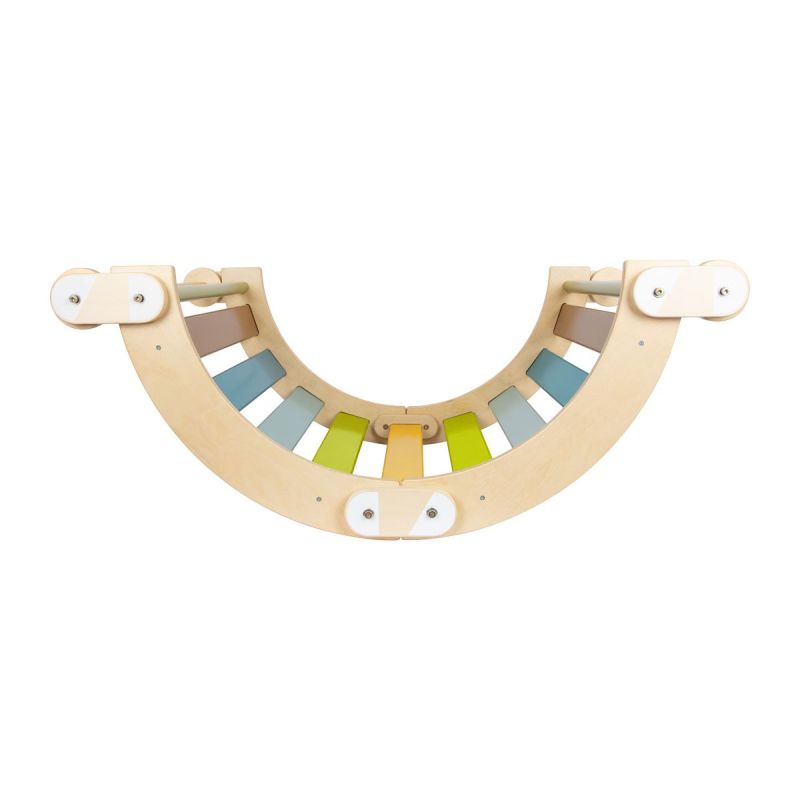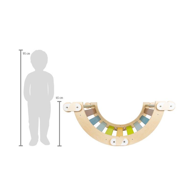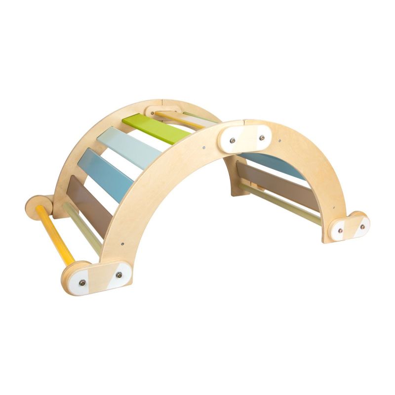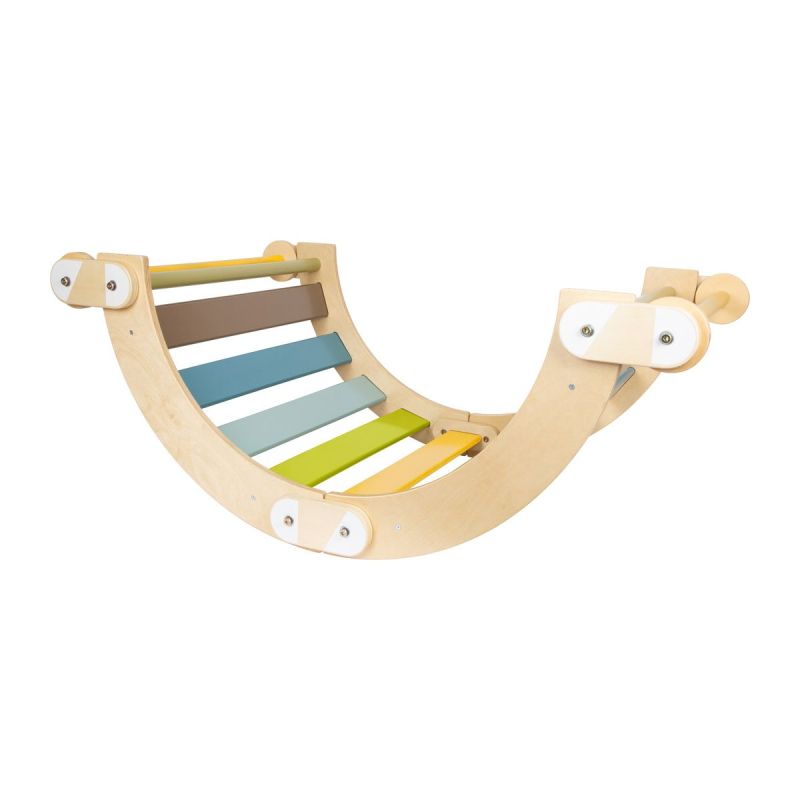 Катерене, люлеене и плъзгане! Тази дървена люлка за катерене е многофункционална универсална дъга с всякакви възможности за творческа игра и насърчаване на развитието на двигателните умения и способностите за движение.