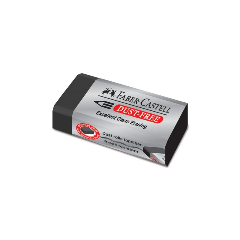 Серията гуми Dust-Free на Faber-Castell предлага най-доброто и чисто изтриване. Гумата не съдържа вреден пластификатор – фталат. Уникалната формула "без отпадъци" прави гумата мека и гарантира отлично и чисто изтриване. Специалната форма е проектирана за прецизно изтриване и предотвратяване на счупване по време на употреба. Произведена е от дерматологично тествани и продукти.