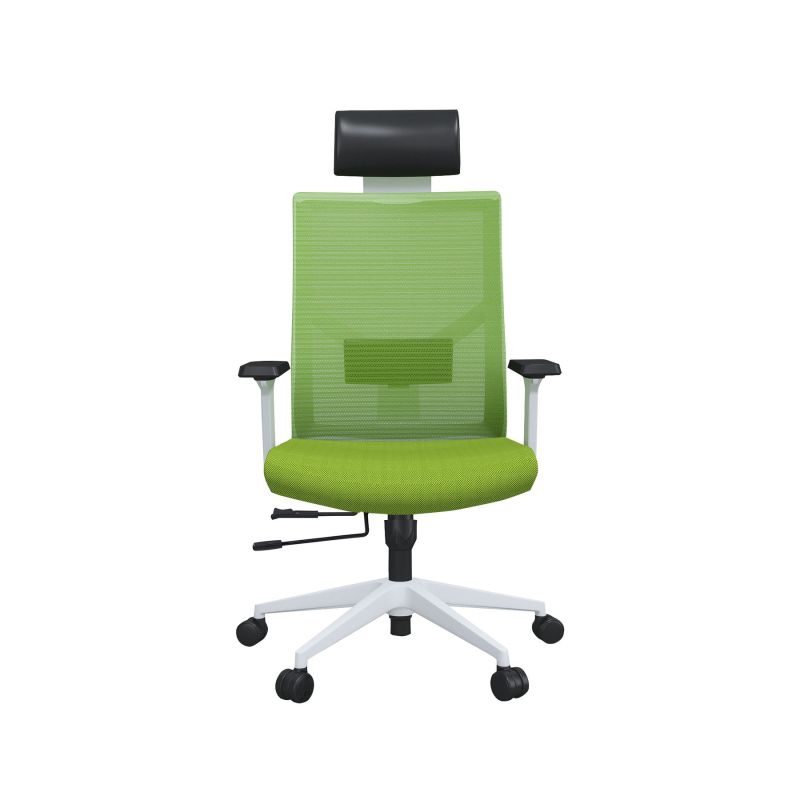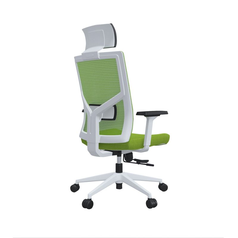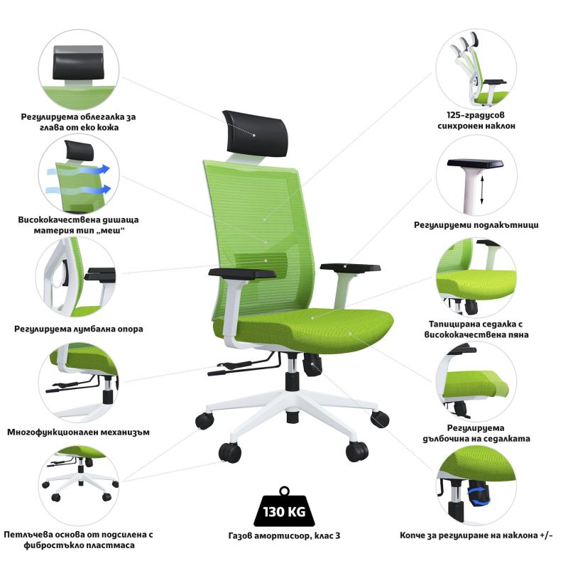 Какво да очаквате от столове Snow HBИновативния дизайн и модерна визия, които безупречно следват тенденциите за ергономия на офис столовете, ще го направят чудесно попълнение към всеки интериор. Стилният му акцент е в изящната снежно бяла рамка и стабилната петлъчева основа, която ще Ви осигури мобилност през целия ден. За да поддържате добрия тонус на тялото си има допълнителна опора за главата, изработена от еко кожа, както и специално проектирана лумбална опора, която да държи всяка извивка на гръбначния стълб в правилна позиция и предотвратява появата на болки в гърба и лумбалната област при продължително седене. Дишащата материя тип „меш“, от която е изработена облегалката ще позволи на въздуха да преминава свободно и ще предпази гърба Ви от изпотяване и дискомфорт през горещите дни.