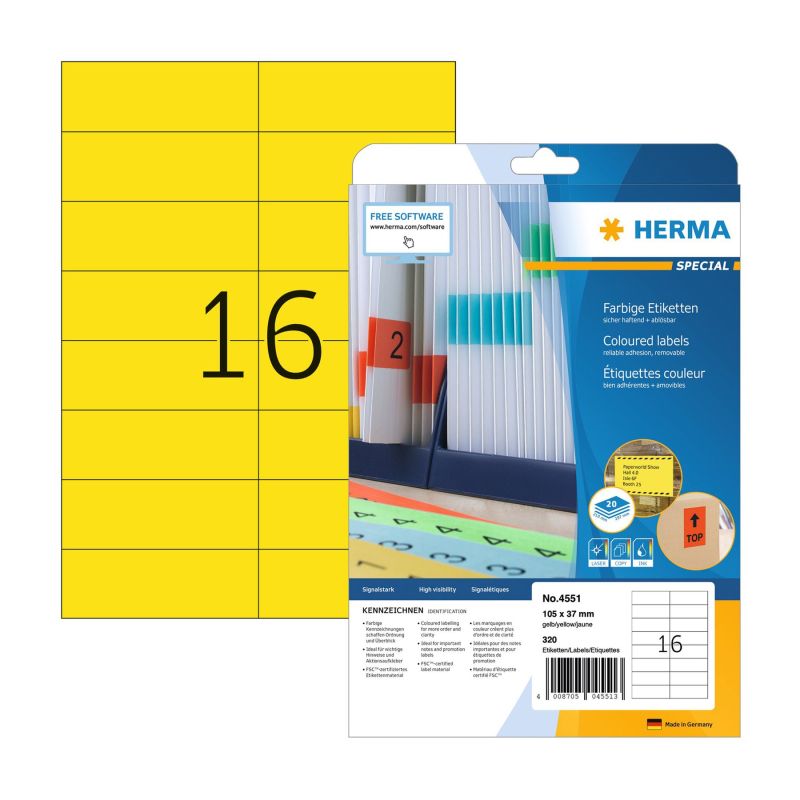 Herma Самозалепващи се етикети, A4, 105 х 37.1 mm, жълти, 16 броя, 20 листа