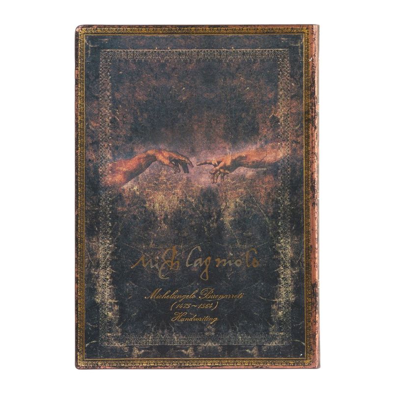 Потопете се в съзнанието на един от най-големите гении в историята на изкуството – Микеланджело Буонароти (1475-1564). Разкъсван между непрестанните битки в съзнанието му между религиозната вяра и езическата красота, той създава истински художествени шедьоври. Смятан за един от майсторите на италианския Ренесанс, през живота си той създава най-хубавите фрески и много от най-почитаните скулптури в света. Микеланджело притежава гений, който е колкото суров и безкомпромисен, толкова и плодотворен. Дизайнът на този тефтер от Paperblanks пресъздава писмо, написано собственоръчно от Микеланджело. С всеки удар на перото, то демонстрира изтънчеността и страстта на един от най-великите художници, които човечеството е създало. „Сътворението на Адам“ от Сикстинската капела, представена на задната корица, моментът на сътворението красиво завършва тази украсена тетрадка за ръкописи.Брой страници: 176.
