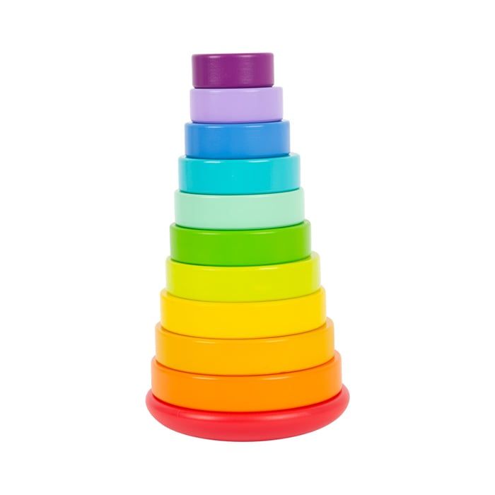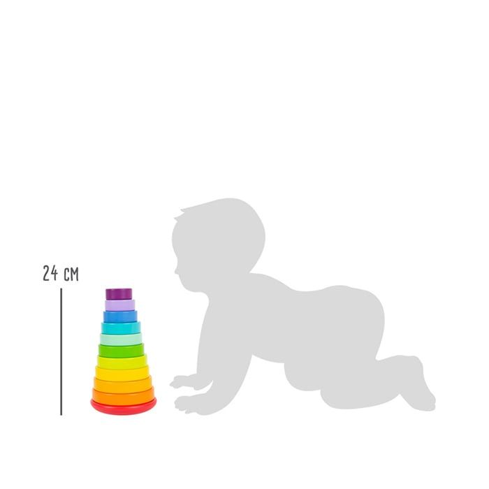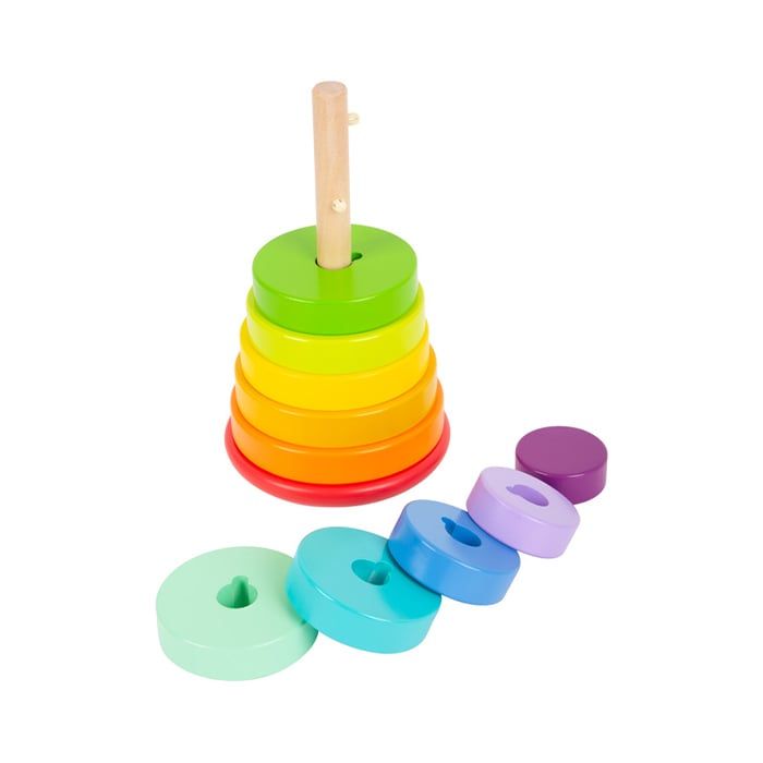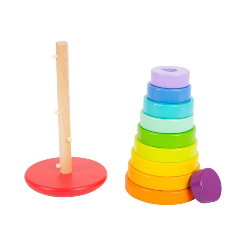 Тази голяма дървена кула за подреждане в цветовете на дъгата прави впечатление с допълнителна задача: различните по размери дървени дискове трябва не само да бъдат избутани върху стойката в правилния ред, но и да бъдат обърнати в правилната позиция, така че празнините в дисковете да съвпадат с позицията на малките щифтове на полюса.