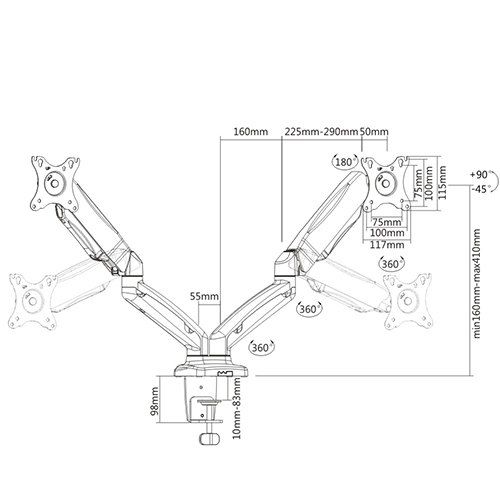 Тази стойка е регулируема и има възможност за въртене: +90° – 45°, наклон: + 90 ° – 45 °, ротация: + 180 ° – 180 °.