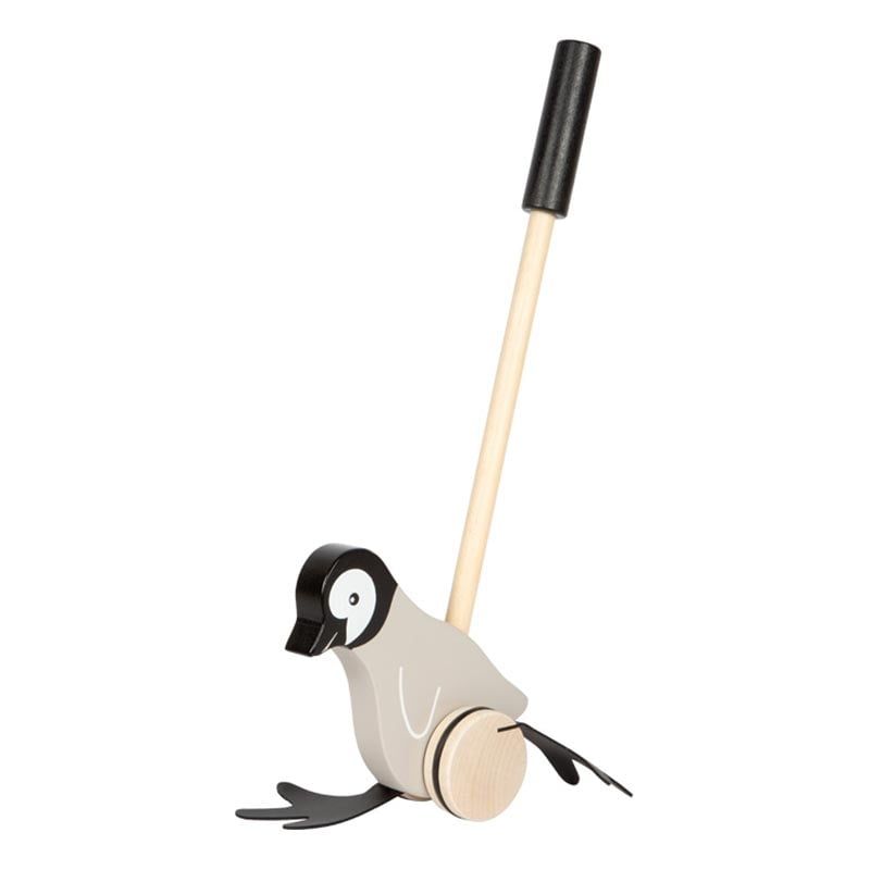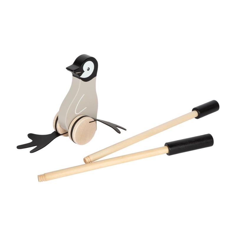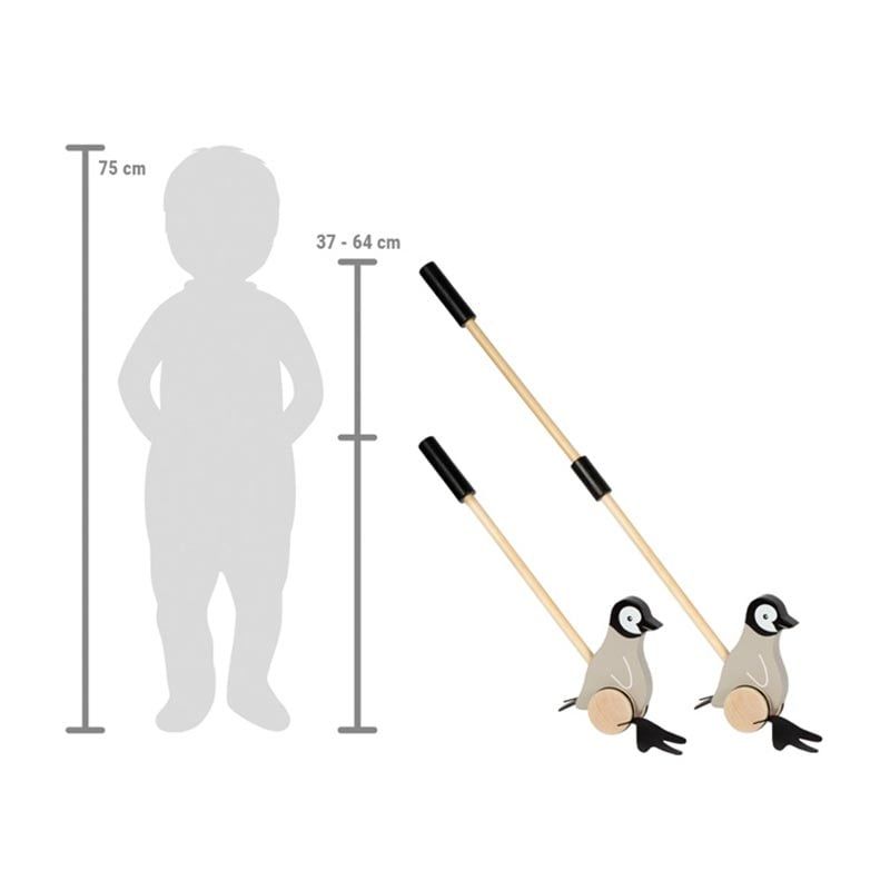 Играчката е част от категорията дървени играчки за бутане, които насърчават развитието на баланса и двигателните умения. При движение пингвинът се поклаща леко, което добавя допълнително забавление и мотивира детето да продължи да се движи. Дръжката е удобна за хващане, а здравите дървени колела осигуряват плавно и безопасно бутане.