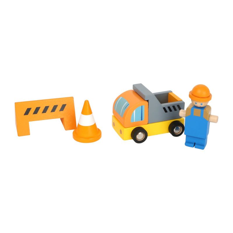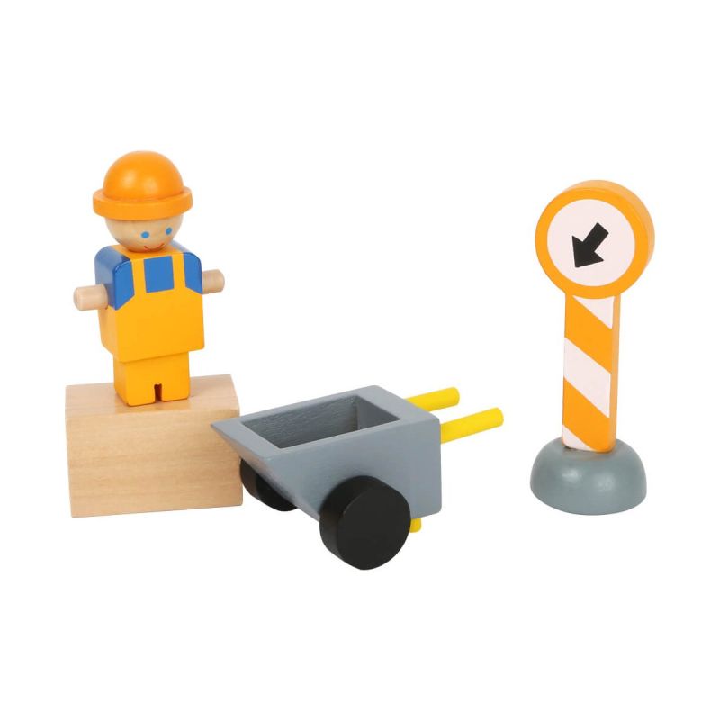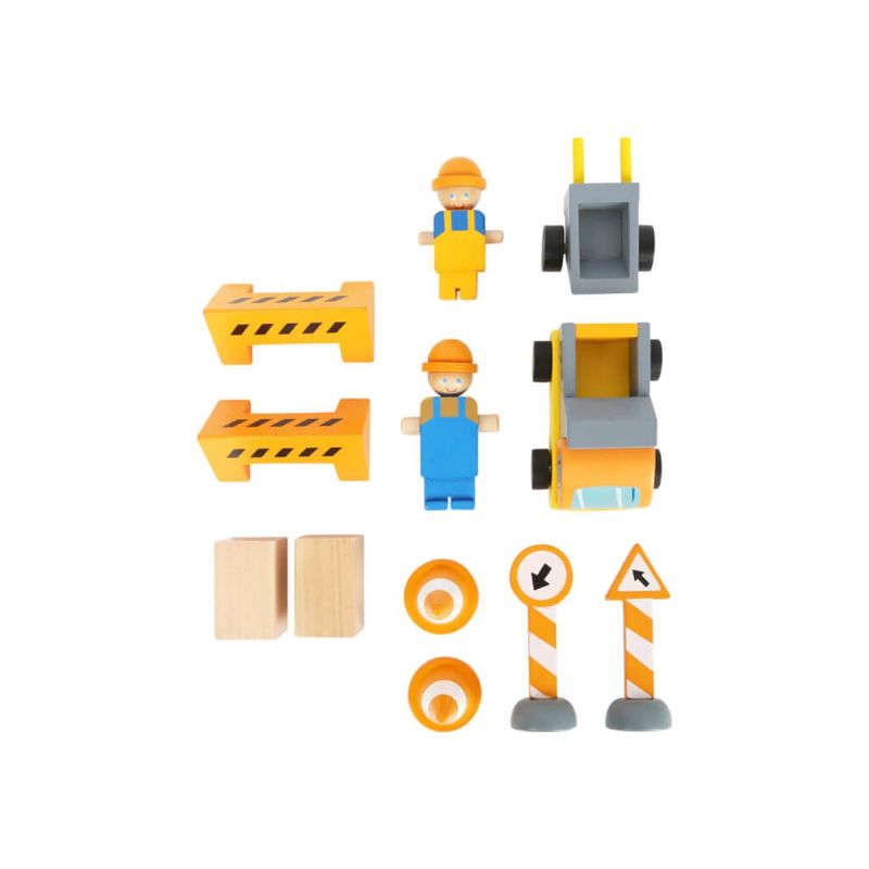 Комплектът включва бариери, конуси, фигурки на строителни работници, знаци, транспортни устройства и товари, за да се създаде истинска строителна площадка.