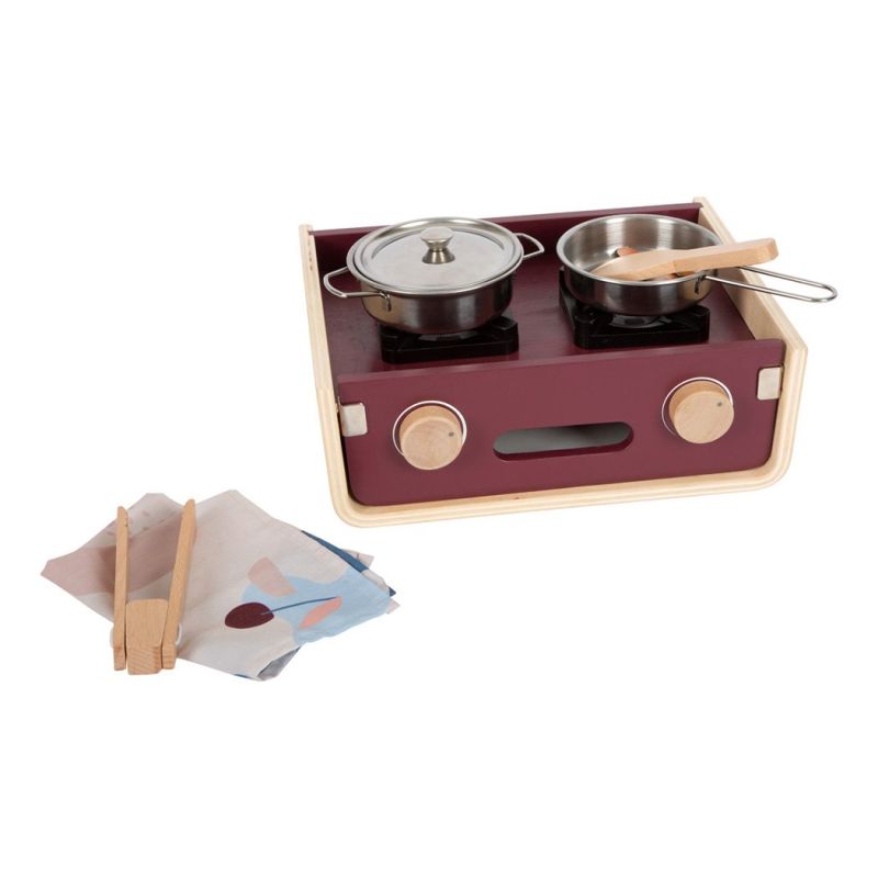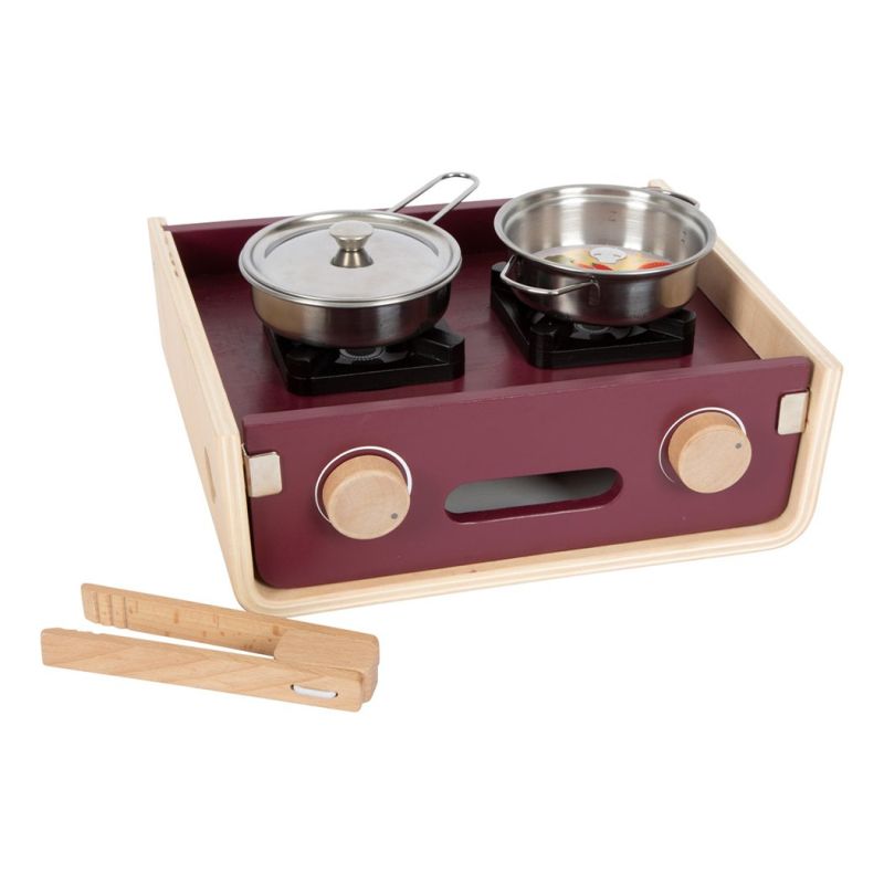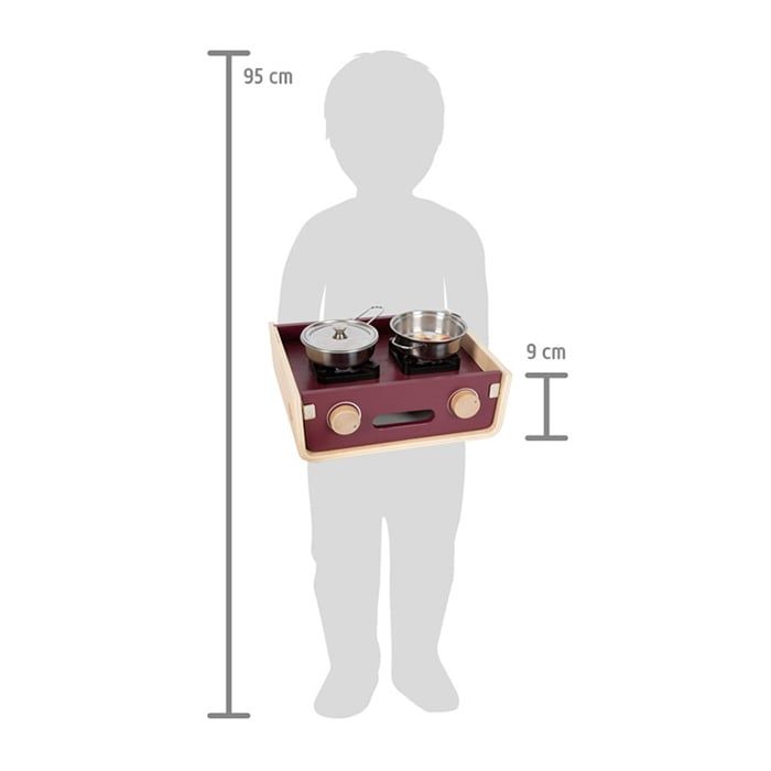 Предлага се с кухненска кърпа, поставка за тенджера, тиган, тенджера с капак, щипка за печене, шпатула и двустранна тава за печене на пица или грил.