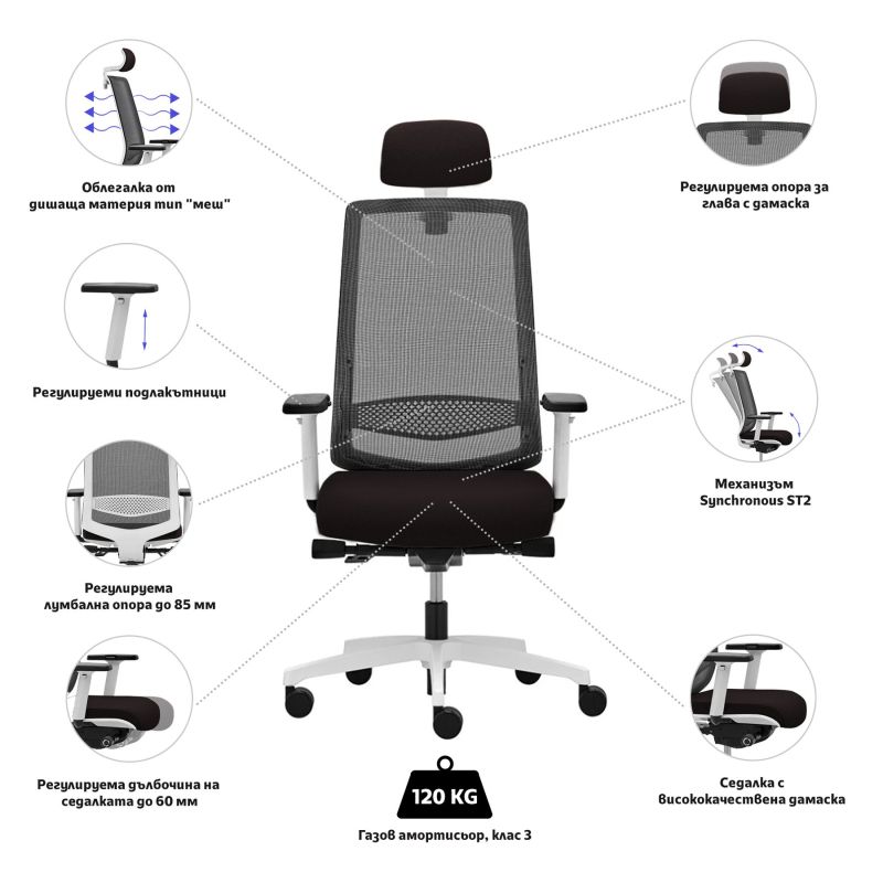 • Столът е оборудван с механизъм Synchronous ST2 за осигуряване на така нареченото динамично седене.