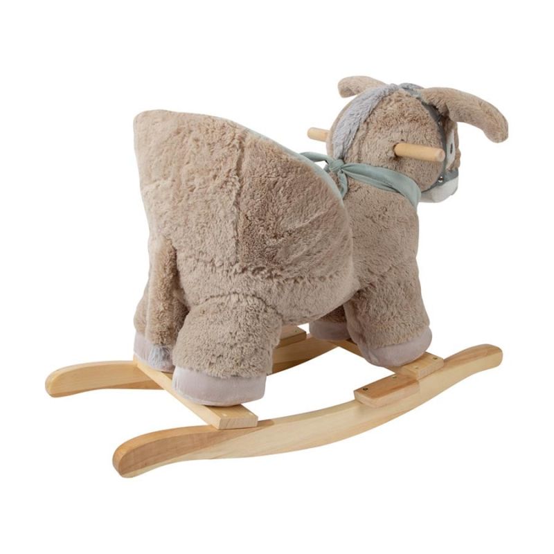 Пухкаво люлеещо се магаренце върху стабилна дървена рамка със седалка тип седло и облегалка. Насърчава равновесието и контрола на тялото, като внася нежен декоративен акцент в детската стая.