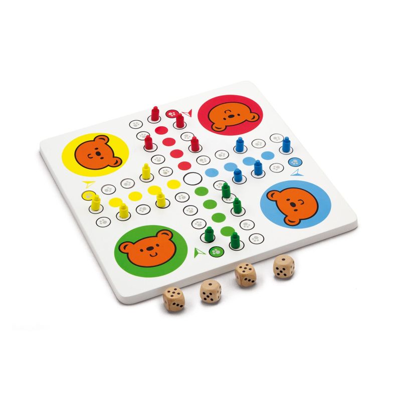 Дървената кутия съдържа двустранна дъска с игри, мъниста в 9 цвята, 24 карти с образец и 4 дървени зара.