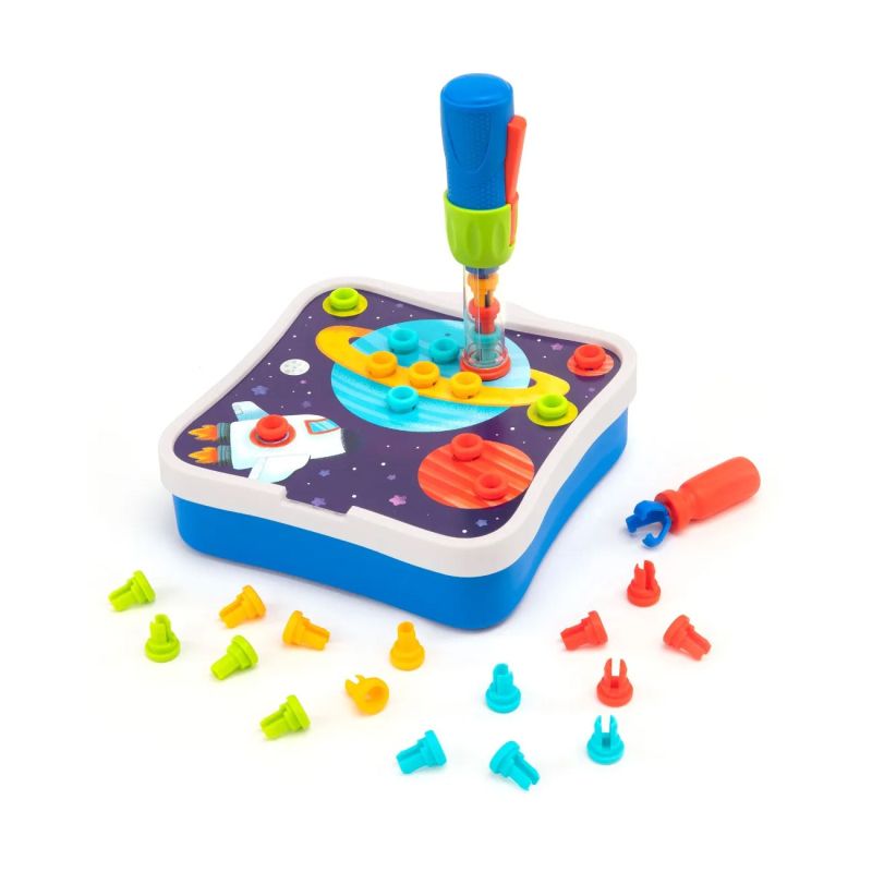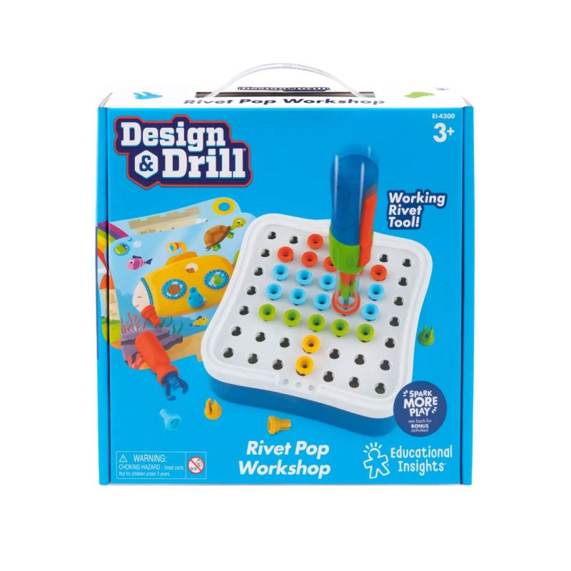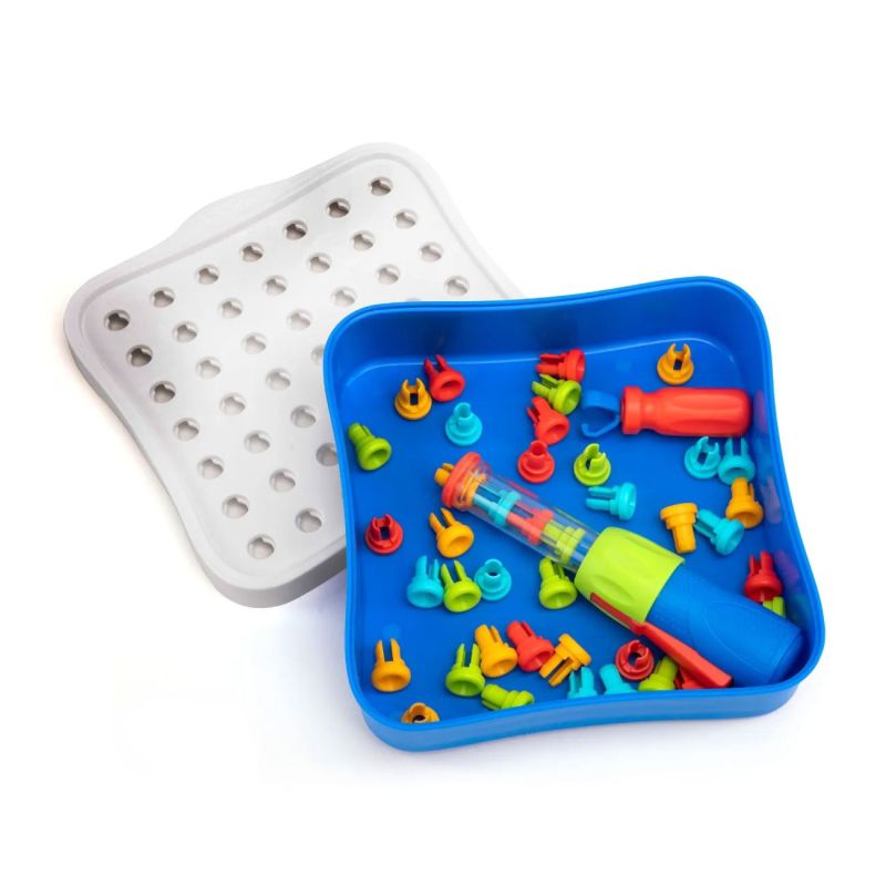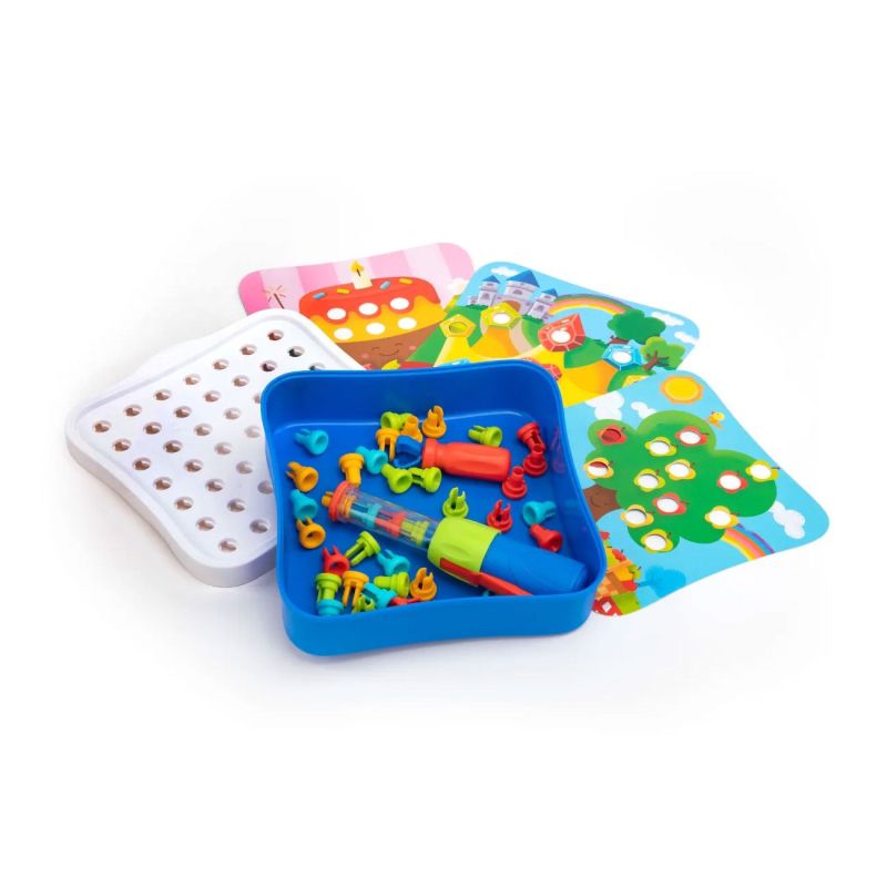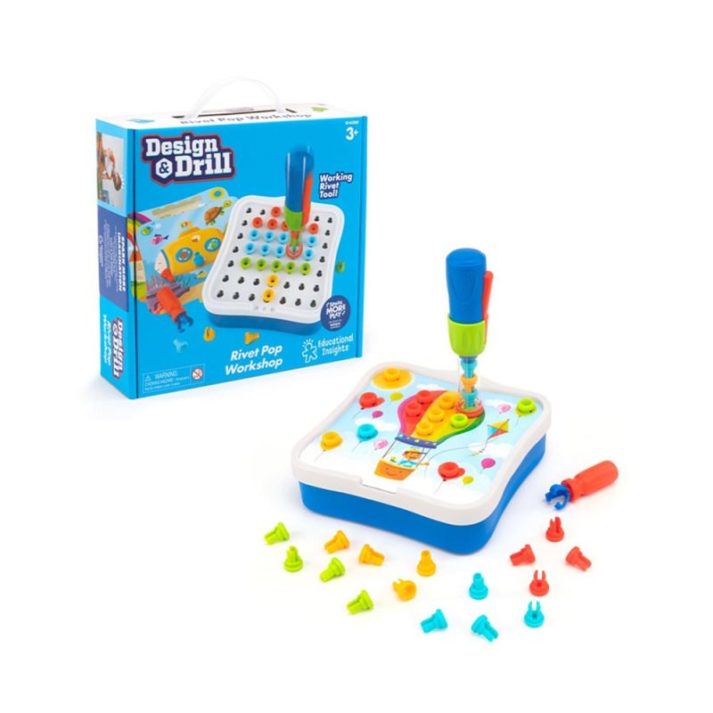 Малките строители използват ръчно задвижван инструмент за нитове, които „изскачат“, когато бъдат поставени, за да завършат цветните шарки на включените карти с дейности.