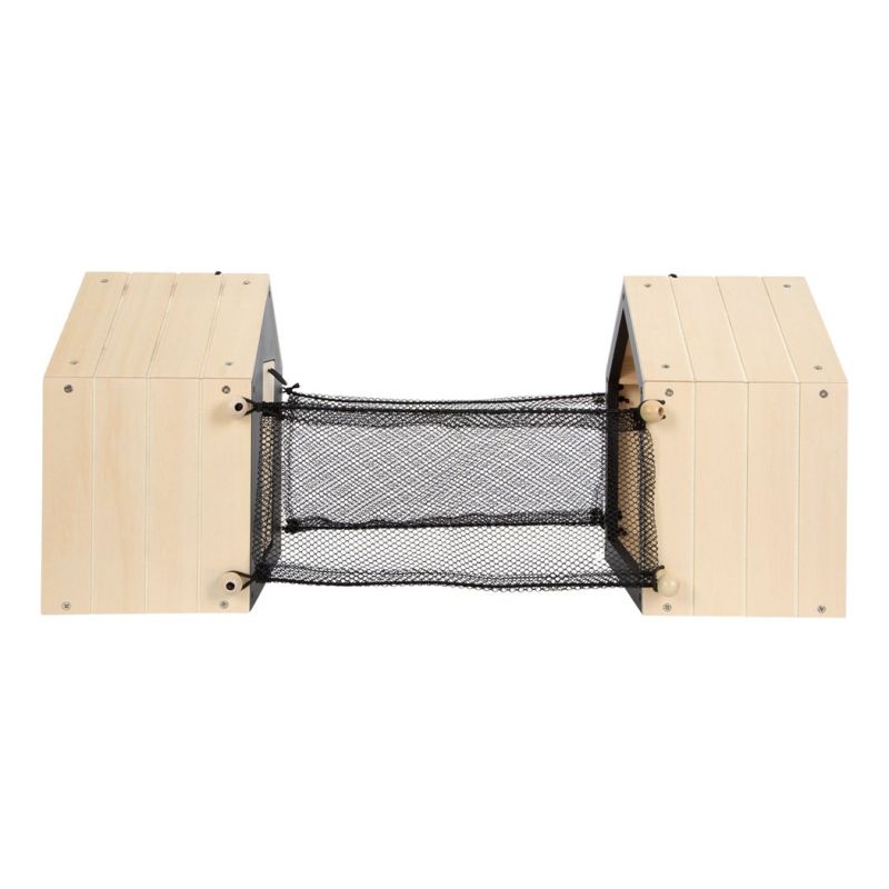 Къщичка за зайци за плюшените дългоуши! Тази двойна колиба, изработена от стабилно дърво, която може да се използва и за транспортиране, се състои от две малки колиби, които могат да бъдат свързани чрез топки и примки.