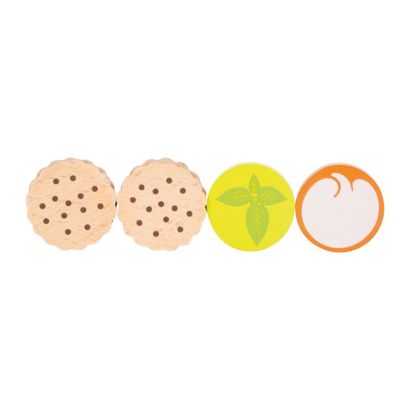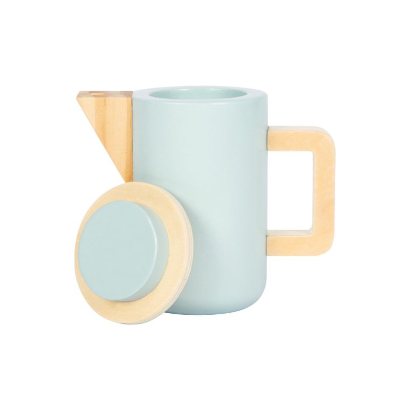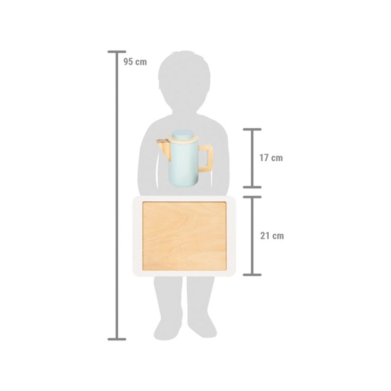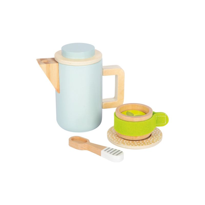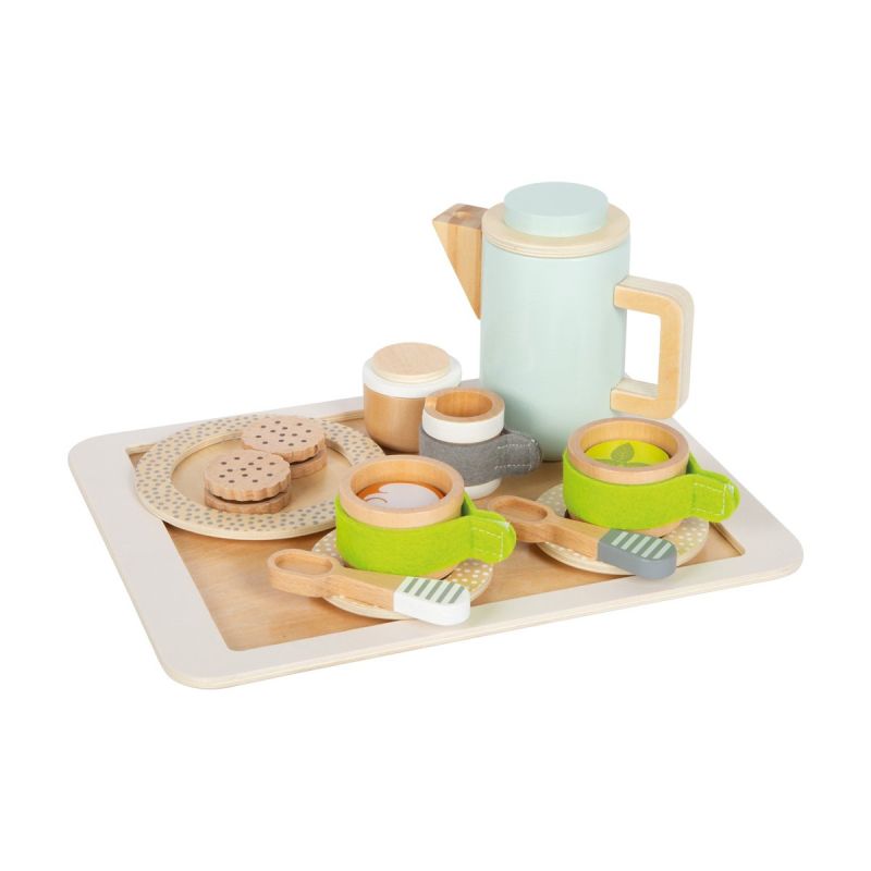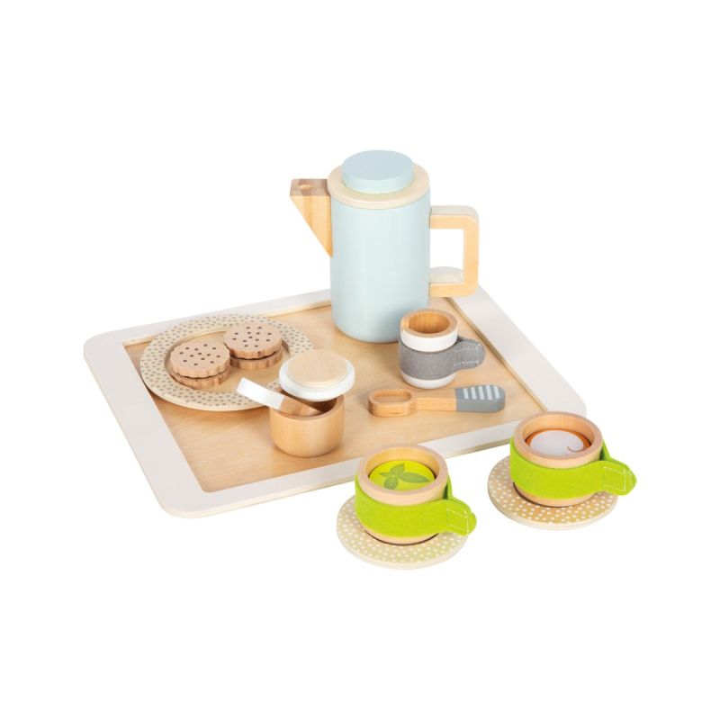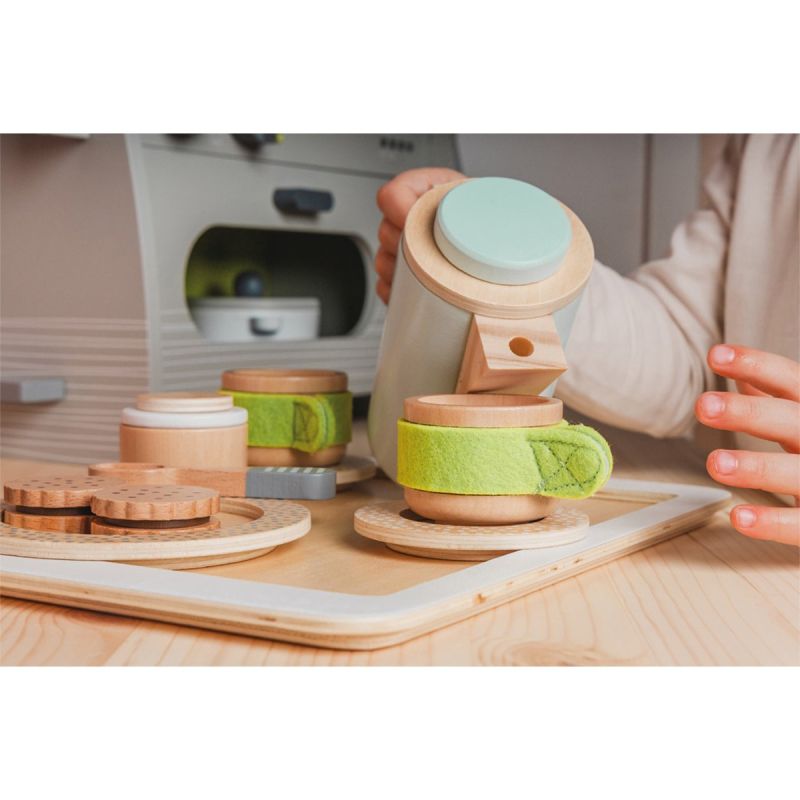 Комплект за кафе и чай с елегантен дизайн с модерни цветове, красиви детайли, голямо количество дървени материали и приятни на допир части от филц. Ролевата игра насърчава развитието на въображението и социалните умения.