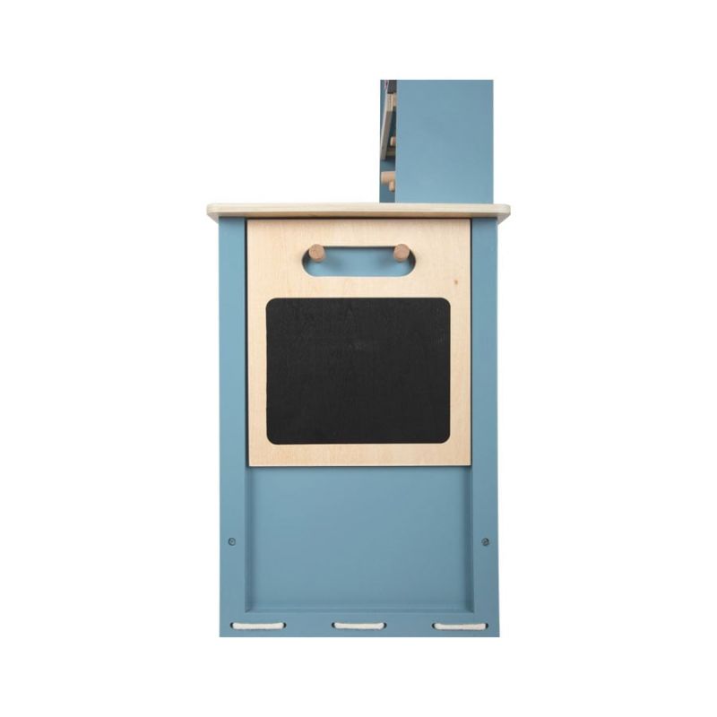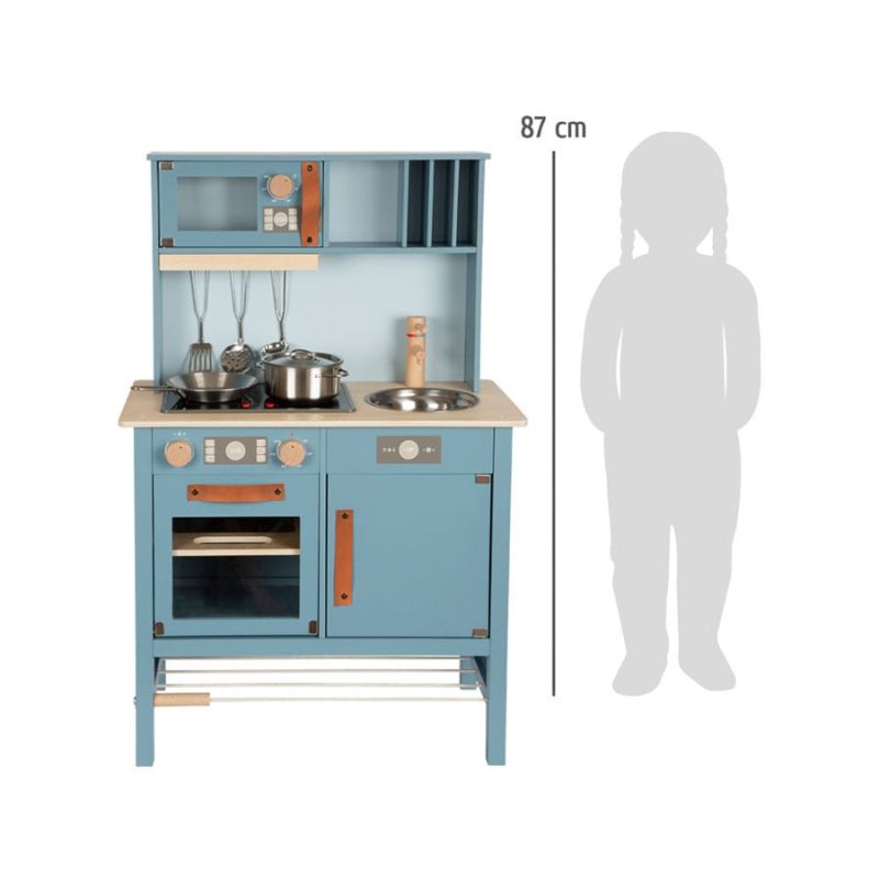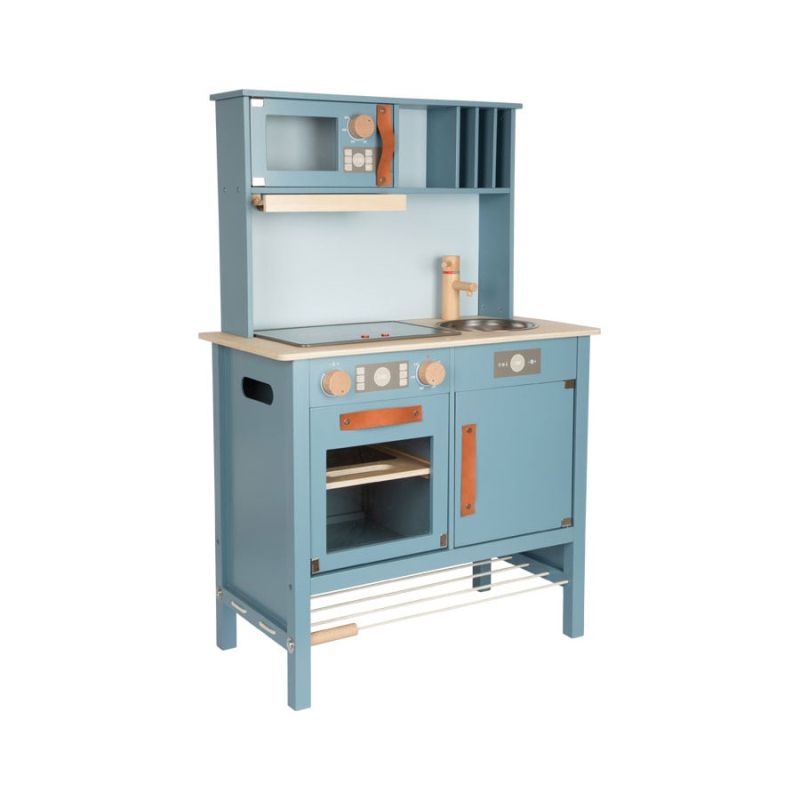 Стабилно конструирана, тази кухня за игра прави страхотно впечатление с модерната си цветова гама, включително модерния цвят "опушено синьо", съчетан с дръжки от изкуствена кожа в цвят коняк.