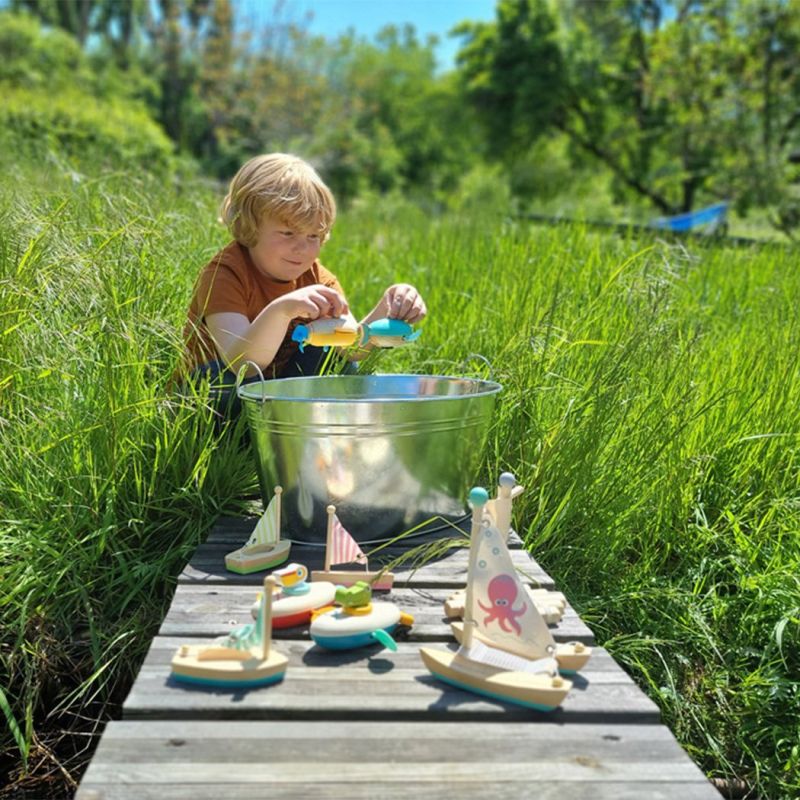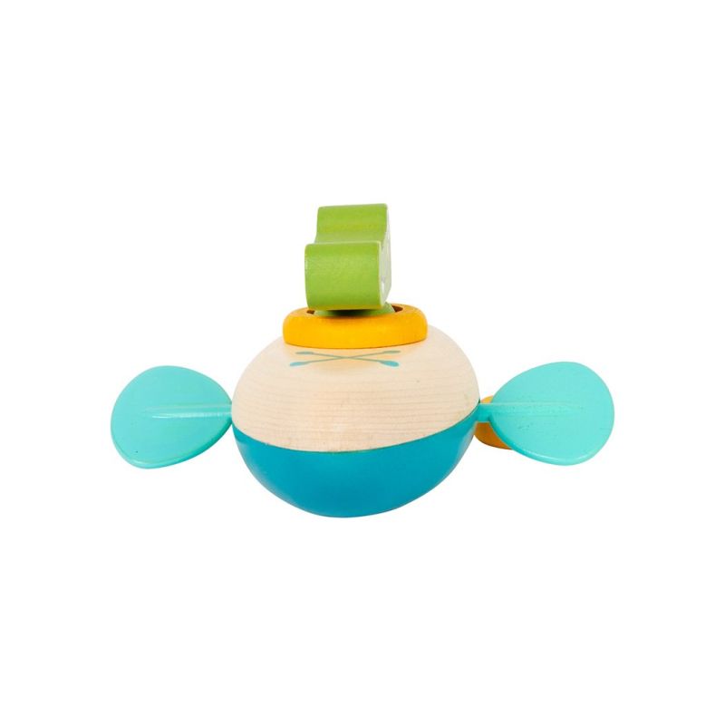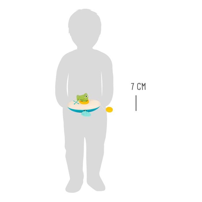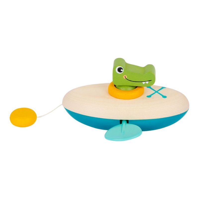 Този сладък дървен крокодил и неговото кану, направено от дърво и пластмаса, ще осигурят огромно забавление при къпане, когато той пътува сам из водата.