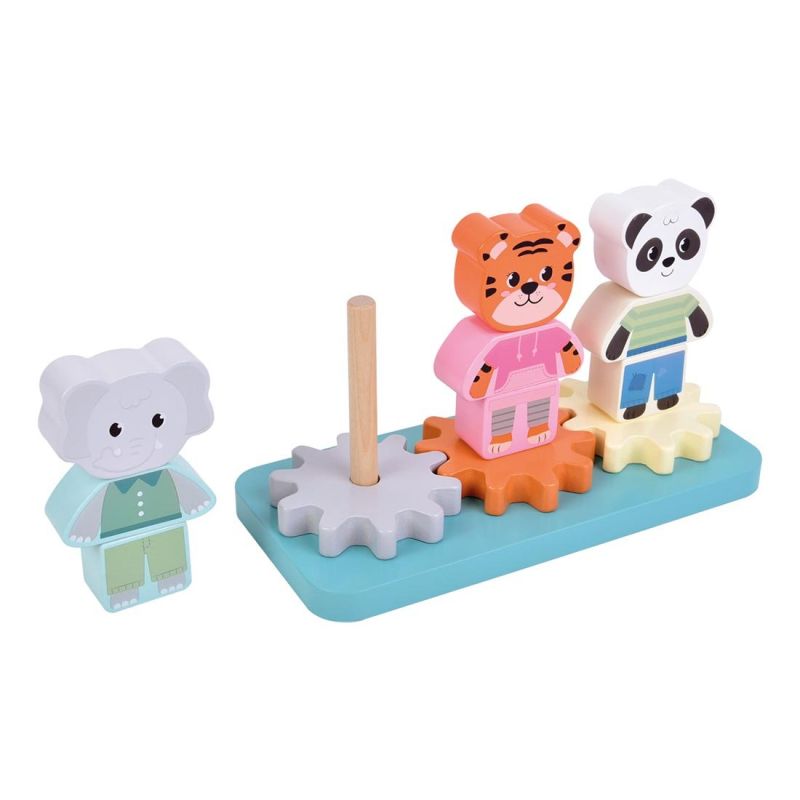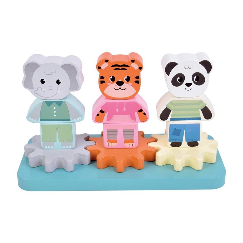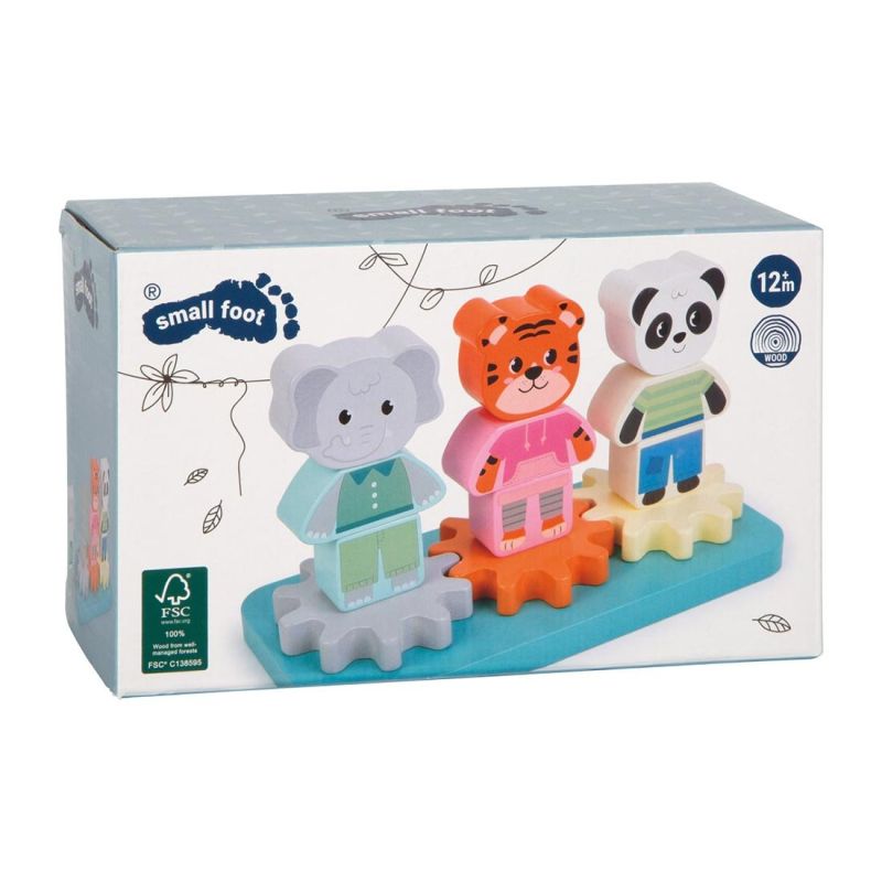 Три приятелски животни от джунглата се превръщат в движещи се машини: всяка фигура се състои от три части и се подрежда върху основа със зъбни колела. Завърти едната и всички се завъртат—интуитивен начин да се открие връзката причина-следствие, докато се упражняват прецизни движения на ръцете.