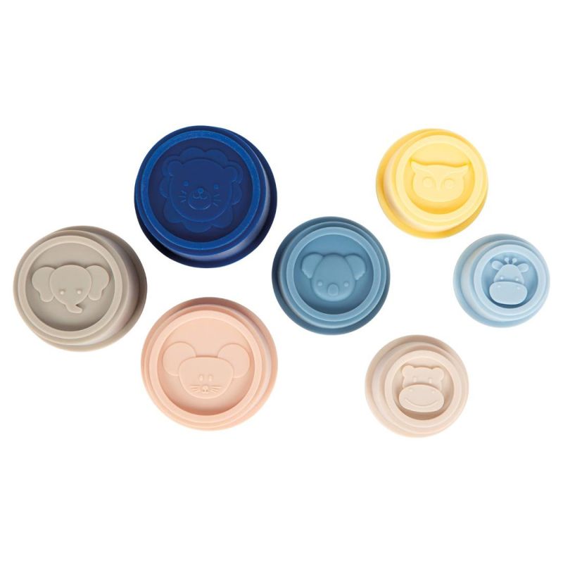 - 7 чашки за подреждане, изработени от мек, BPA-free силикон с очарователни животински мотиви.