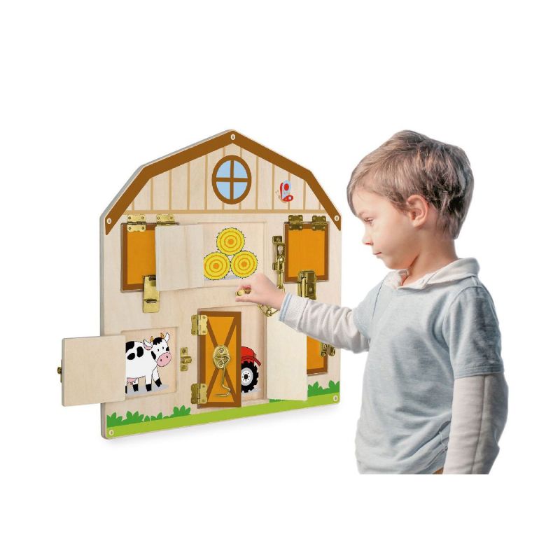Върху дървен панел има 6 чифта врати, а зад тях са скрити картинки на животни и предмети.