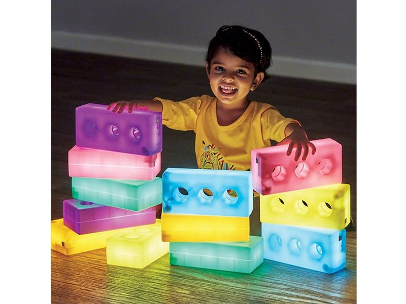Този комплект от иновативни, презареждащи се блокчета превръща играта в магическо светлинно изживяване. Всяко блокче се активира с разклащане и започва да свети в ярки цветове. Светлината остава активна около 3 минути, след което е достатъчно леко потупване, за да се включи отново. Това позволява на децата да играят с часове, като развиват умения за причинно-следствени връзки, стимулират сетивата си и експериментират, изграждайки светлинни кули и разнообразни конструкции.Комплектът включва 12 блокчета в шест цвята – синьо, зелено, жълто, оранжево, розово и лилаво. Изработени са от здрав пластмасов материал, безопасен за малки деца. Идеален избор за сензорна терапия, занимания в детска градина, терапевтични центрове или за вълнуваща домашна игра.Време за зареждане: около 3-4 часа.