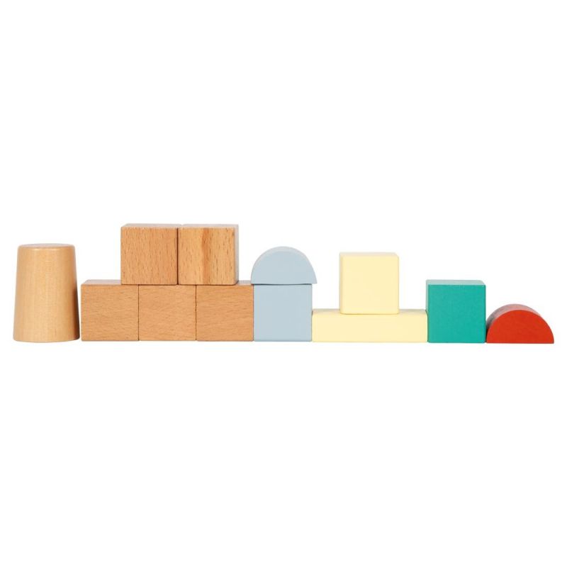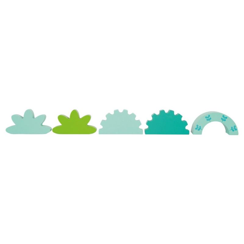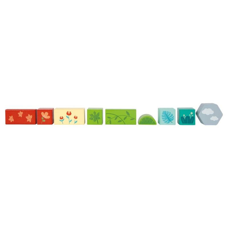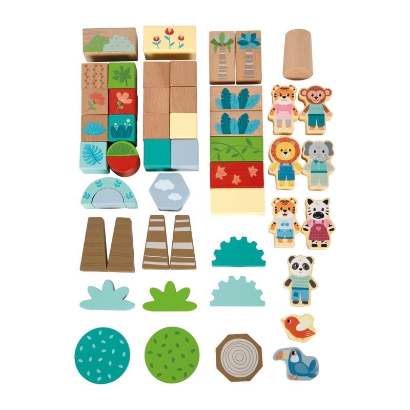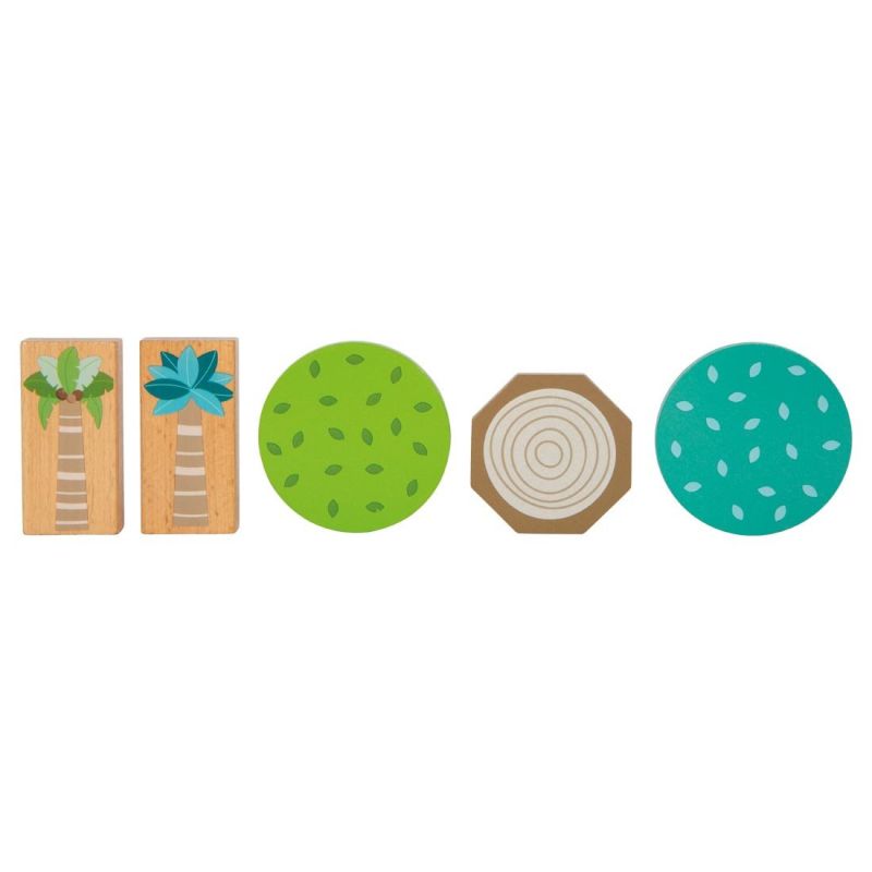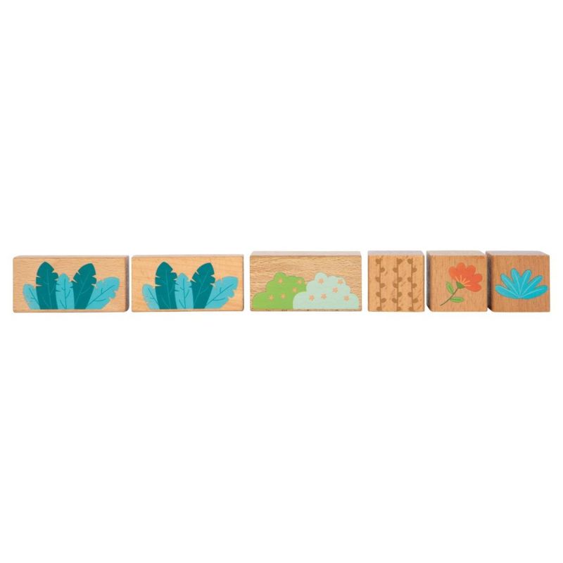 Характерен комплект дървени блокчета в модерен джунгла стил. Разнообразните форми и дружелюбни мотиви канят към свободно строене, изграждане на пътеки и малки игрални светове, докато естествените дървесни тонове се вписват прекрасно в детската стая.