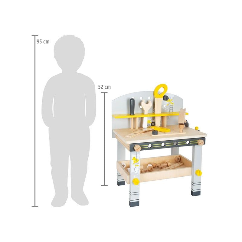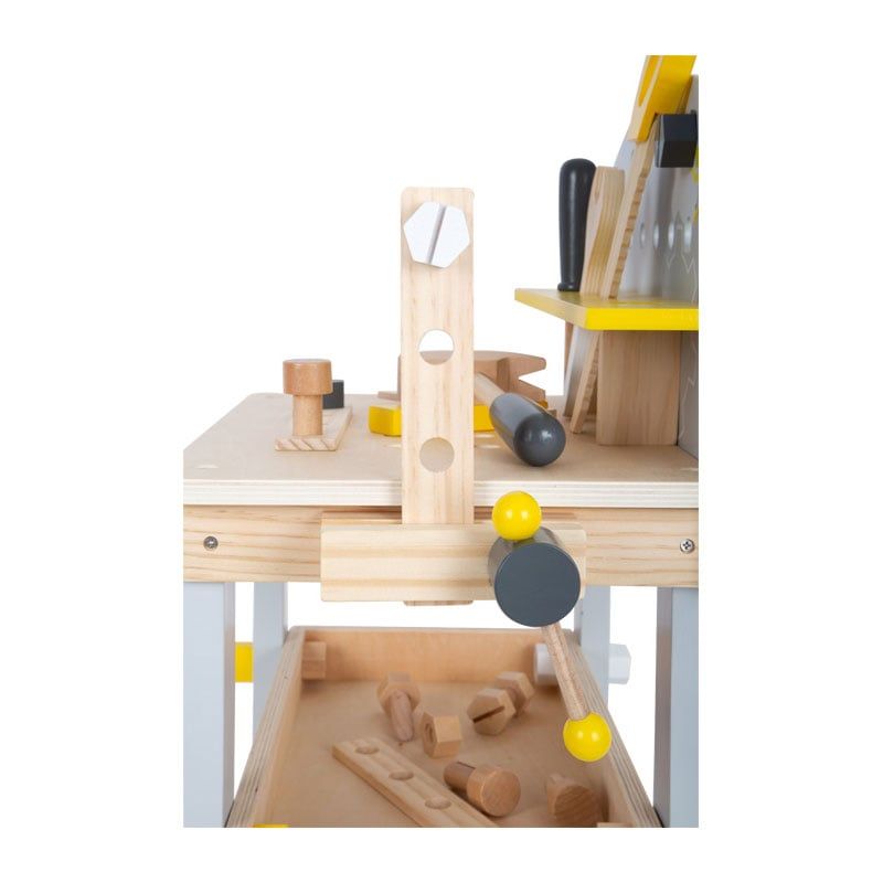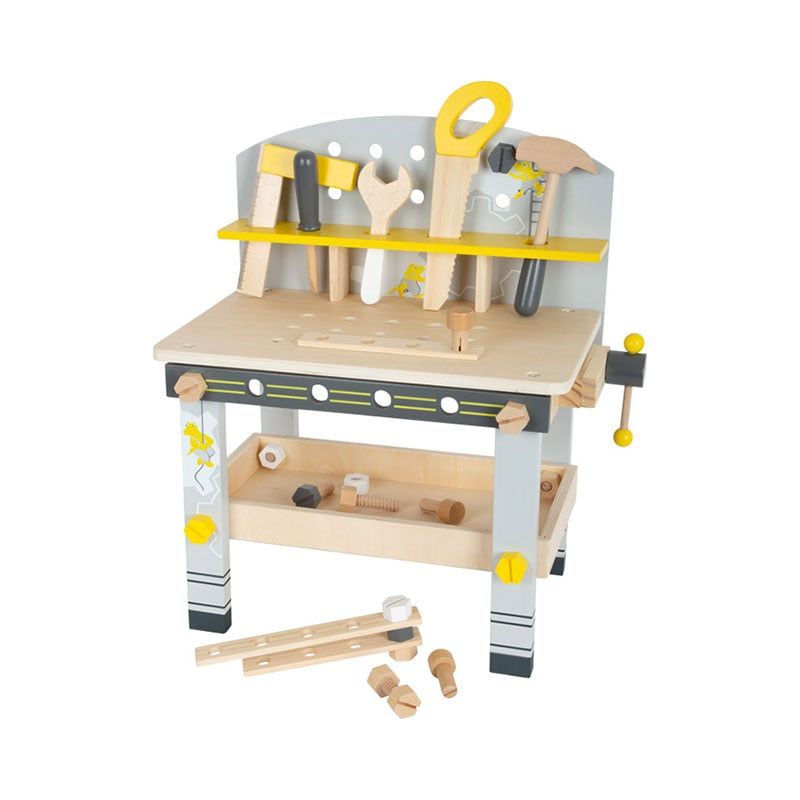 Работна дървена маса с инструменти, насърчаваща активната ролева игра при децата и тренираща техните ръчни умения.