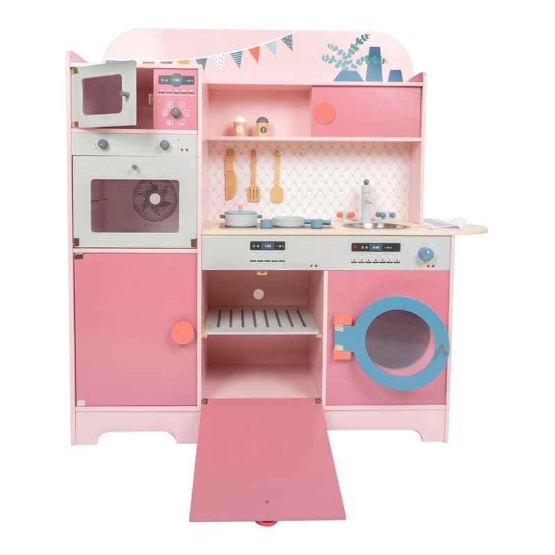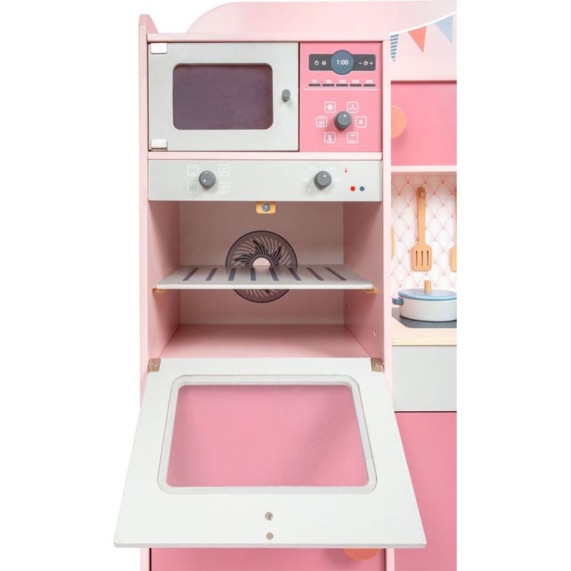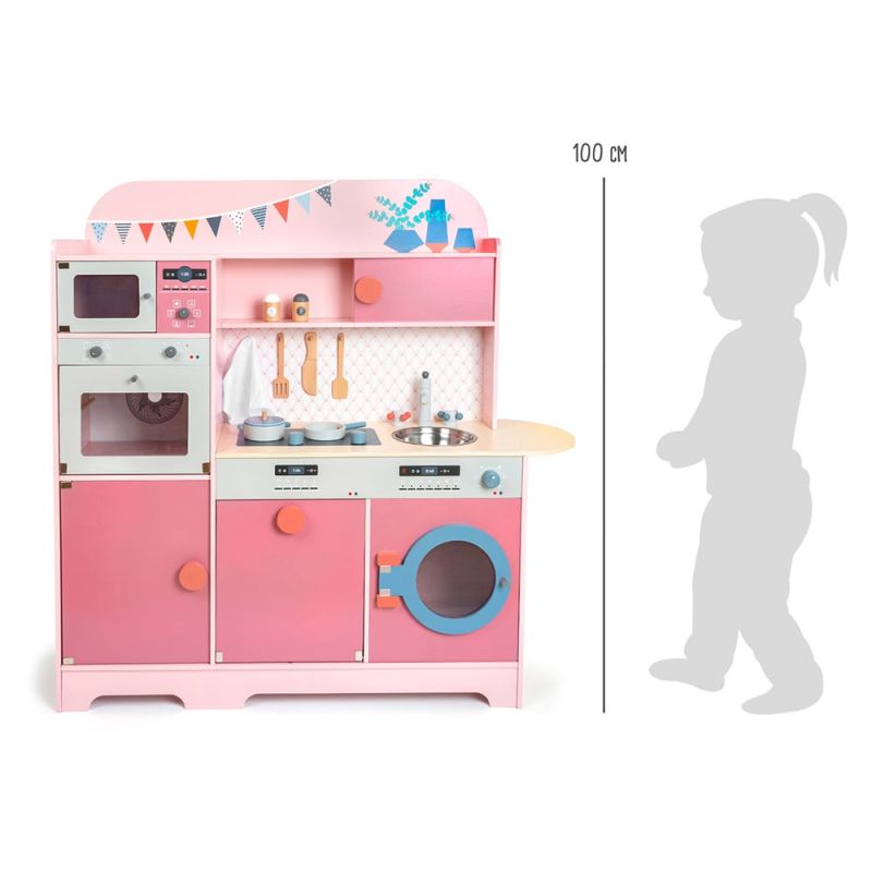 Детската кухня, изработена от дърво в ретро розов стил, осигурява дълги часове страхотни игри с мивка, миялна машина, микровълнова фурна и готварска печка – всичко това на достъпно място на нивото на очите на детето.