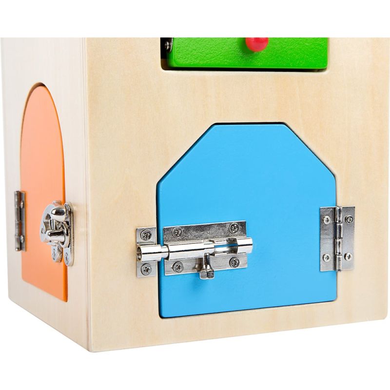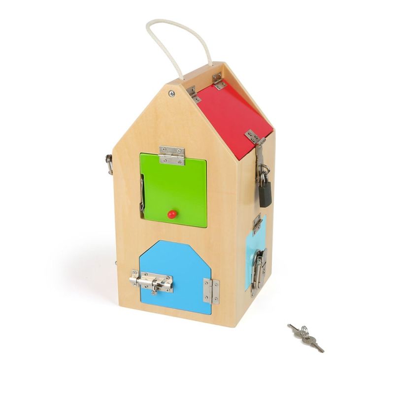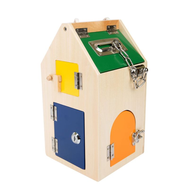 Изработена по най-високите стандарти, дървената къща тренира фините двигателни умения на децата, с помощта на катинар, множество ключалки, лостове, панти и верига на вратата. Направена е от удароустойчив материал, който издържа на по-голямо натоварване. Къщичката е компактна и удобна за пренос.