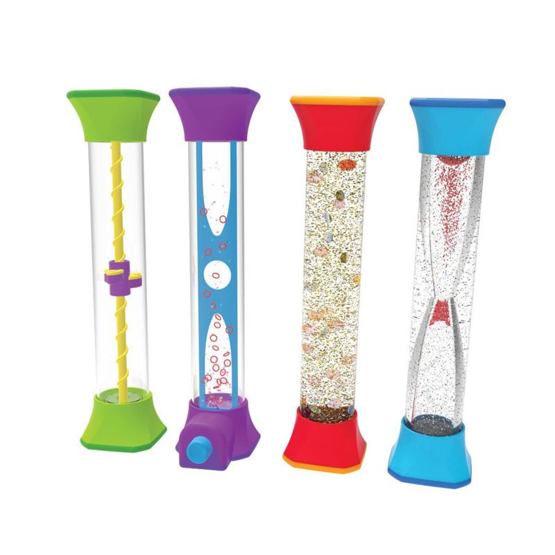 Комплектът съдържа четири туби, всяка от тях предлага уникално хипнотизиращо движение: успокояващ гравитационен спинер, фантастична неподвижна тръба, успокояваща бляскава тръба и вълшебен пясъчен часовник.