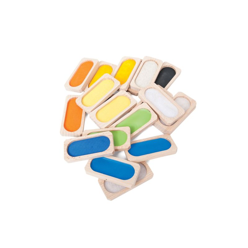 Комплект дървени плочици с различни текстури на повърхността, които стимулират сетивните усещания.