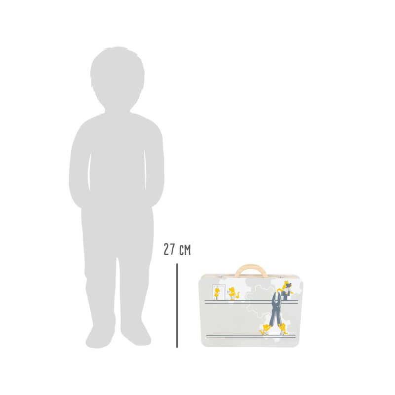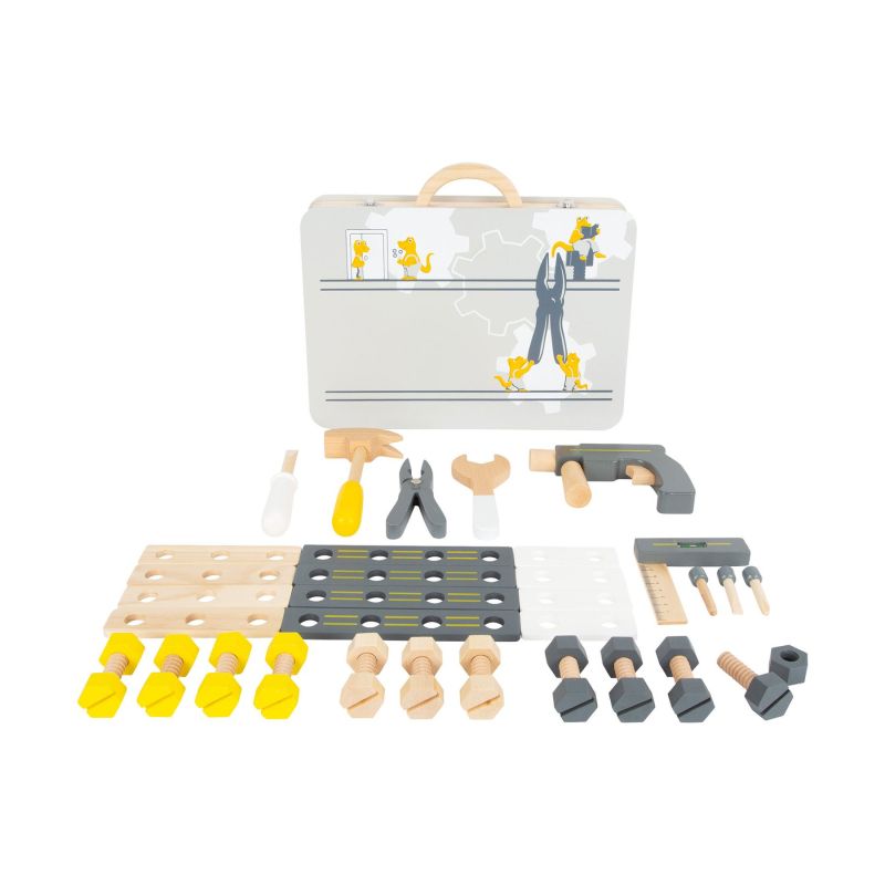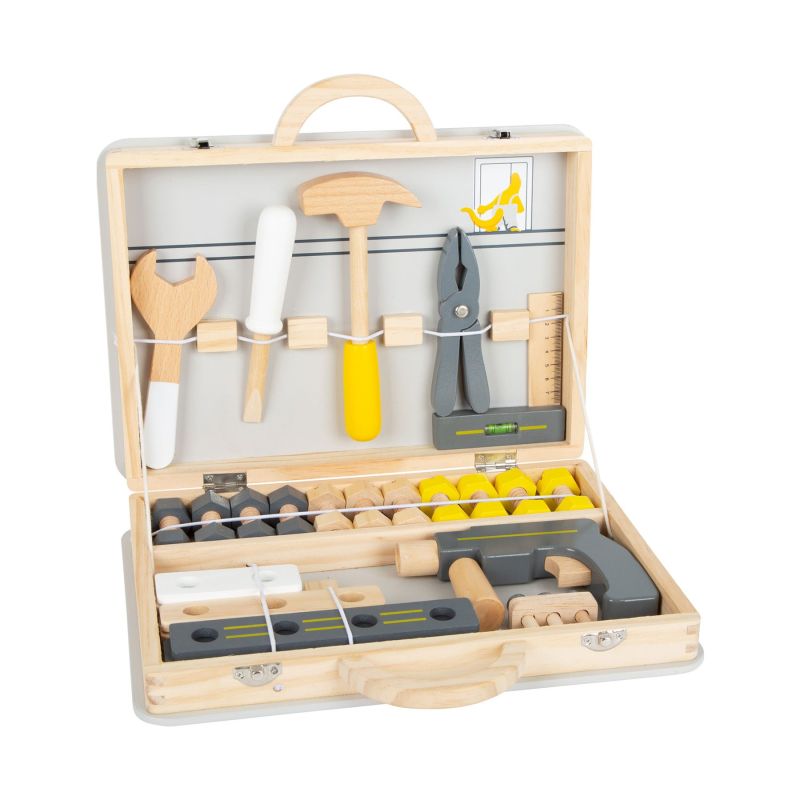 На вниманието на всички малки занаятчии! С дървения куфар с инструменти в класическите цветове на работилницата, децата ще станат едни истински майстори и професионалисти, докато играят. Реалистичните аксесоари и инструменти като нивелир или удобна бормашина, насърчават забавлението по време на игра и мотивацията за нови строителни проекти! Гъвкавите еластични ленти вътре в кутията държат инструментите в правилните позиции, когато малките майстори са в движение. Дървеният материал от който са изработени играчките е идеален за игра, а илюстрациите насърчават детското въображение.