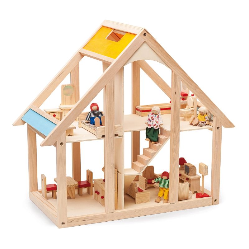 Дървена къща за кукли, изградена от стълбове. Разполага с четири стаи, оборудвани с дървени мебели и стълбище.