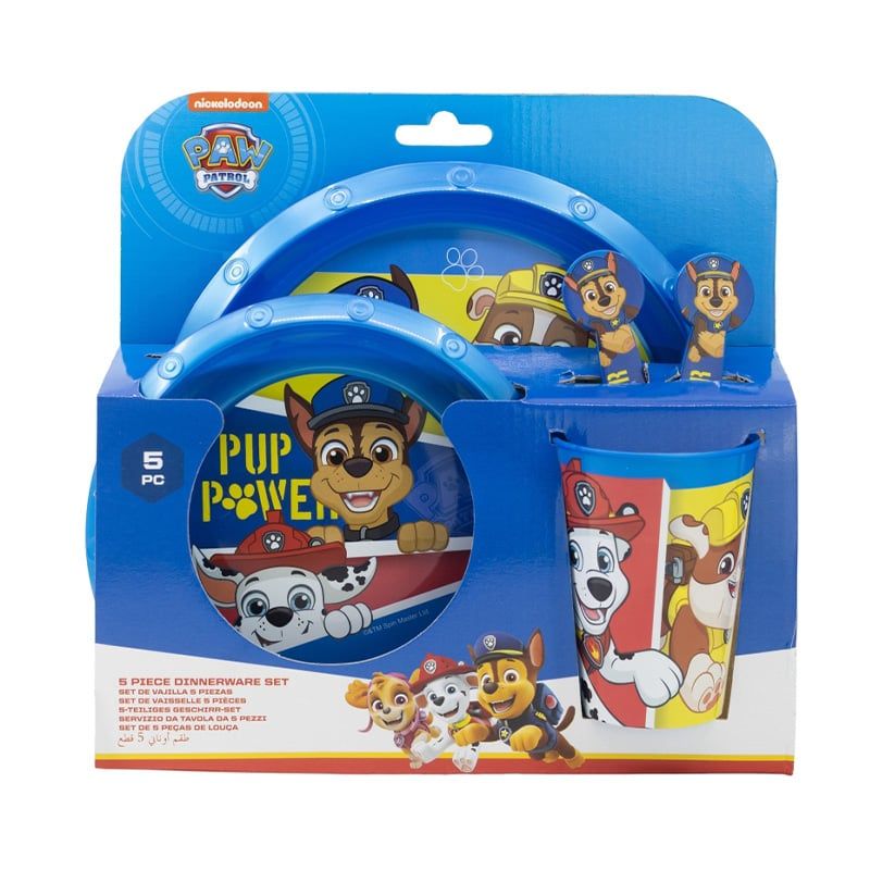 Детски сервиз за хранене за обяд или вечеря „Пес Патрул“, състоящ се от чаша, купа, чиния и прибори.