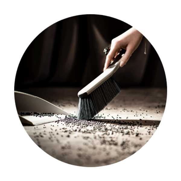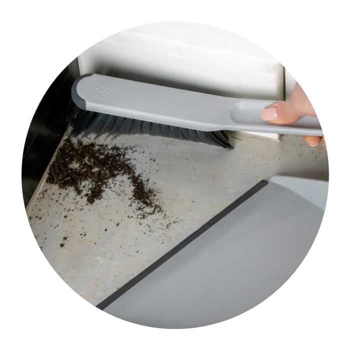 Ръбът на лопатката е покрит с гума, която плътно прилепва към пода или повърхността за почистване, за да направи събирането на трохи и боклуци по-бързо и лесно. По ръбовете има зъбци като гребен, които помагат за премахване на прахоляка от четката.