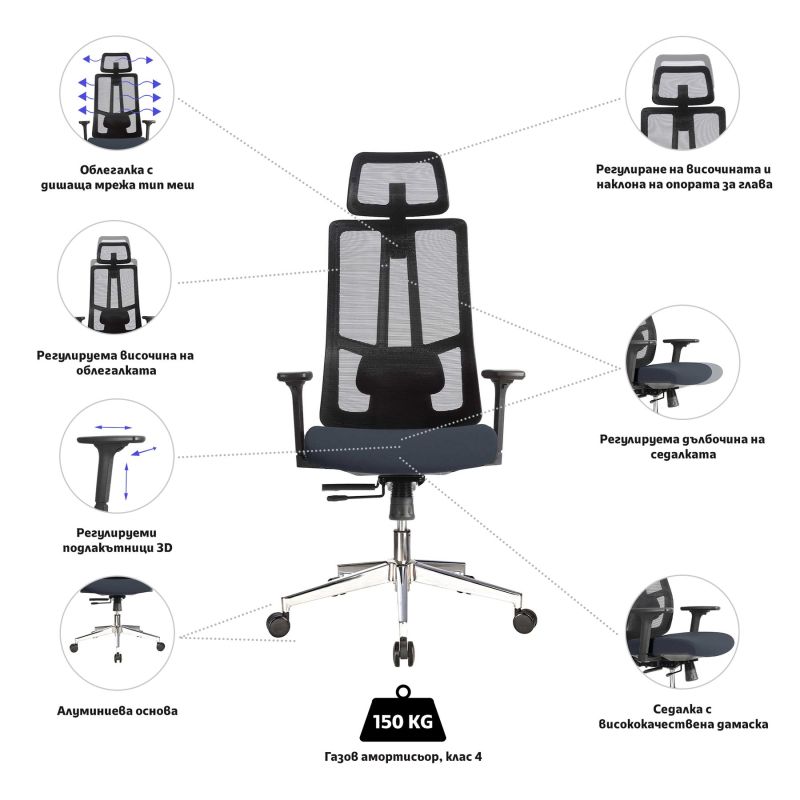 Столът предлага функция за регулиране на височината и наклона на опората за глава. Това ще ви позволи да настроите стола според индивидуалните си потребности.