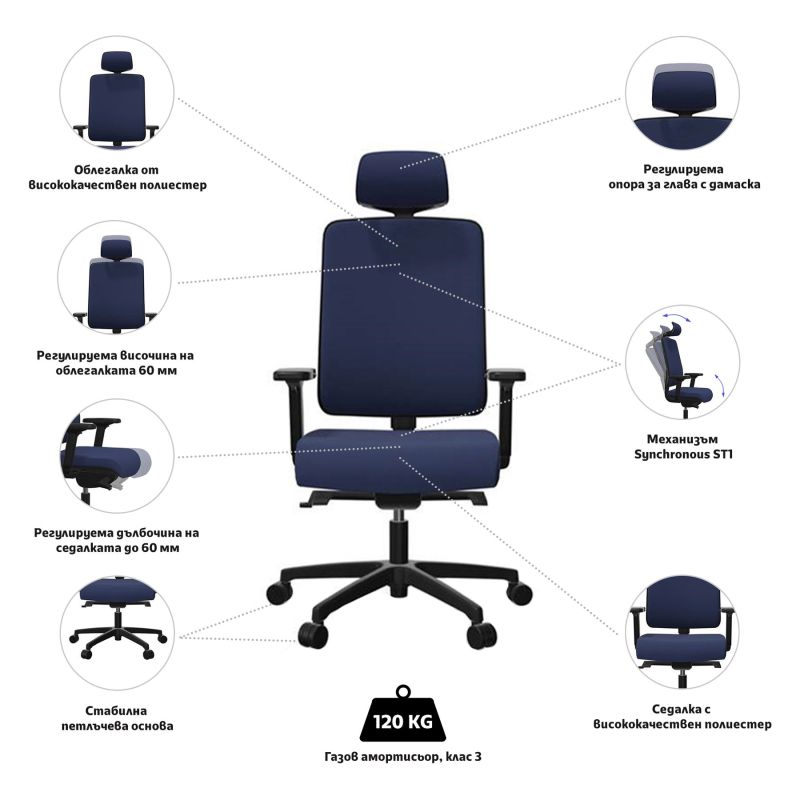 Ергономичен стол Rim Flexi Tech FX 1124, ST1 механизъм, до 120 kg, син