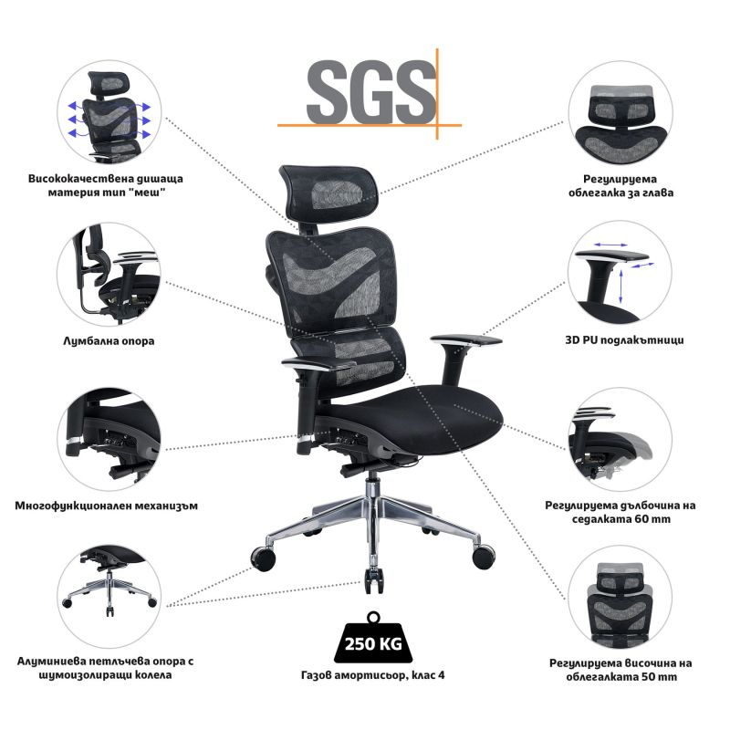 Регулируемата дълбочина на седалката и регулируема височина на облегалката, правят стола подходящ за всеки ръст. 3D подлакътници и регулируема опора за глава за още повече удобство през работния ден.