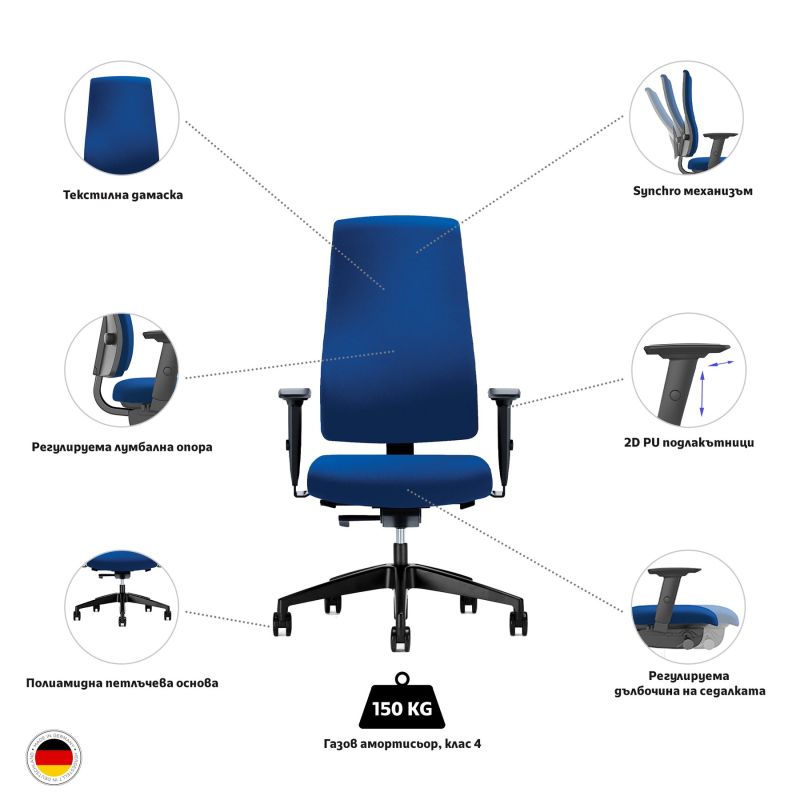 Ергономичен стол Interstuhl Goal 24/7, текстил, Synchronous механизъм, полиамидна основа, до 150 kg, син