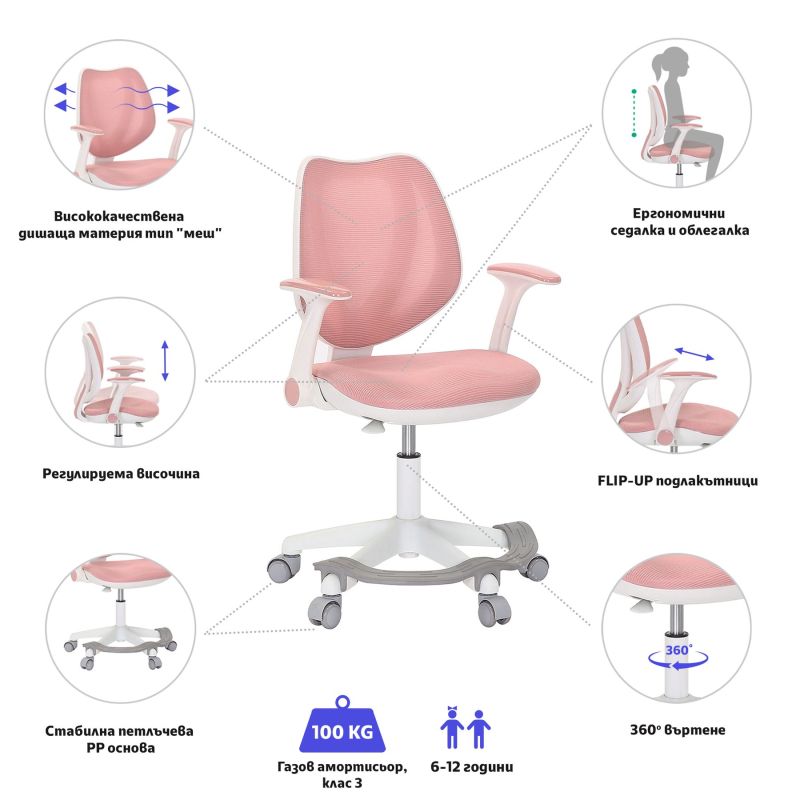 Детски стол RFG Sweety White, меш, до 100 kg, розов