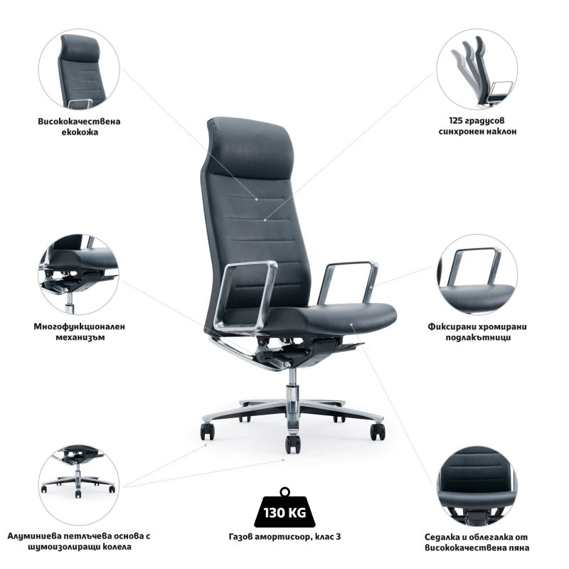 • Седалката, изработена от полиуретанова пяна, тапицирана с висококачествена еко кожа, допълва усещането за стилна визия, като едновременното с това кара тялото Ви да се чувства сякаш седи в мек, пухкав облак! Ще се чувствате удобно през целия ден и тялото Ви със сигурност ще го оцени! Допълнение към ергономичните функционалности на стола е високата облегалка със специален дизайн, включващ допълнителна опора за главата, за да се чувствате добре от главата до петите!