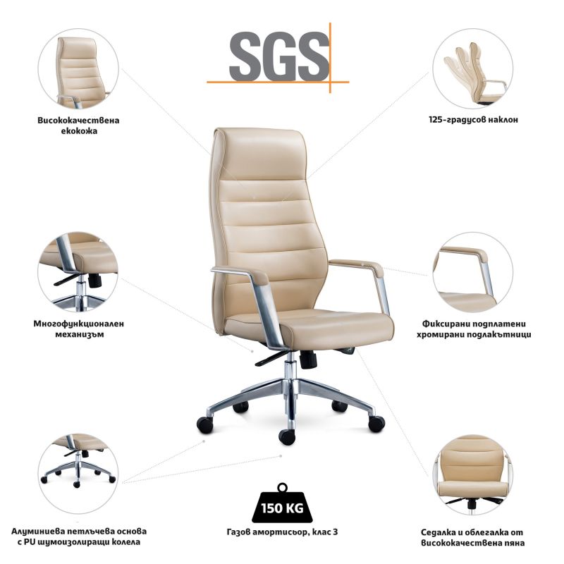 Акцентът, който наистина отличава този стол е зашеметяващия бежов цвят, който излъчва изискан стил и елегантност. Това го прави перфектното допълнение за Вашия офис!
