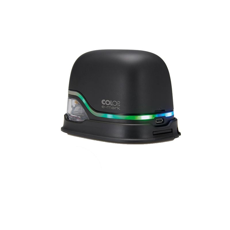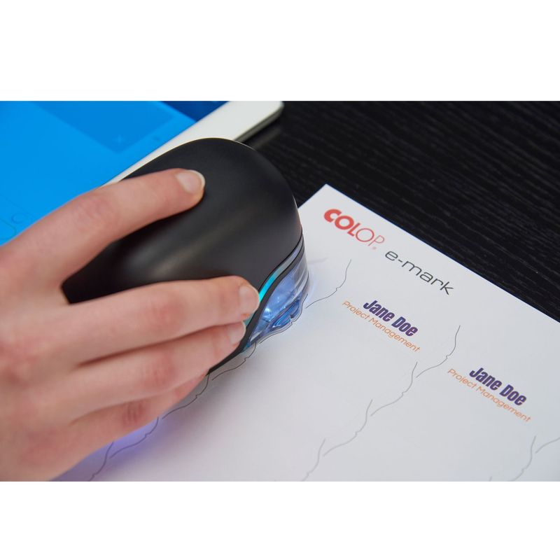 COLOP E-MARK е електронно мобилно маркиращо устройство за създаване и промяна на вашите отпечатъци, чрез използване на приложение от мобилно устройство или компютър. Отпечатва само с едно леко движение.