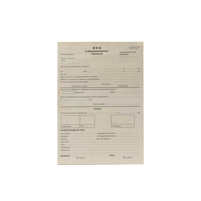 Фиш за имунохематологично изследване, приложение 13